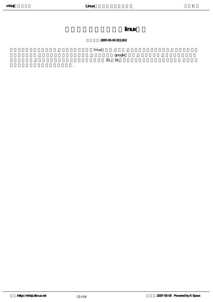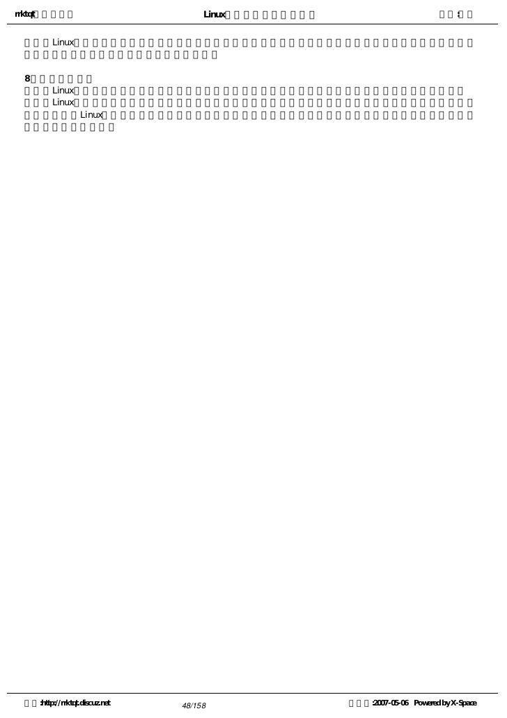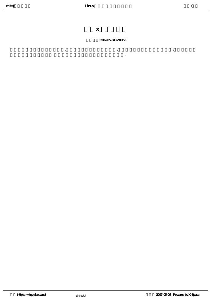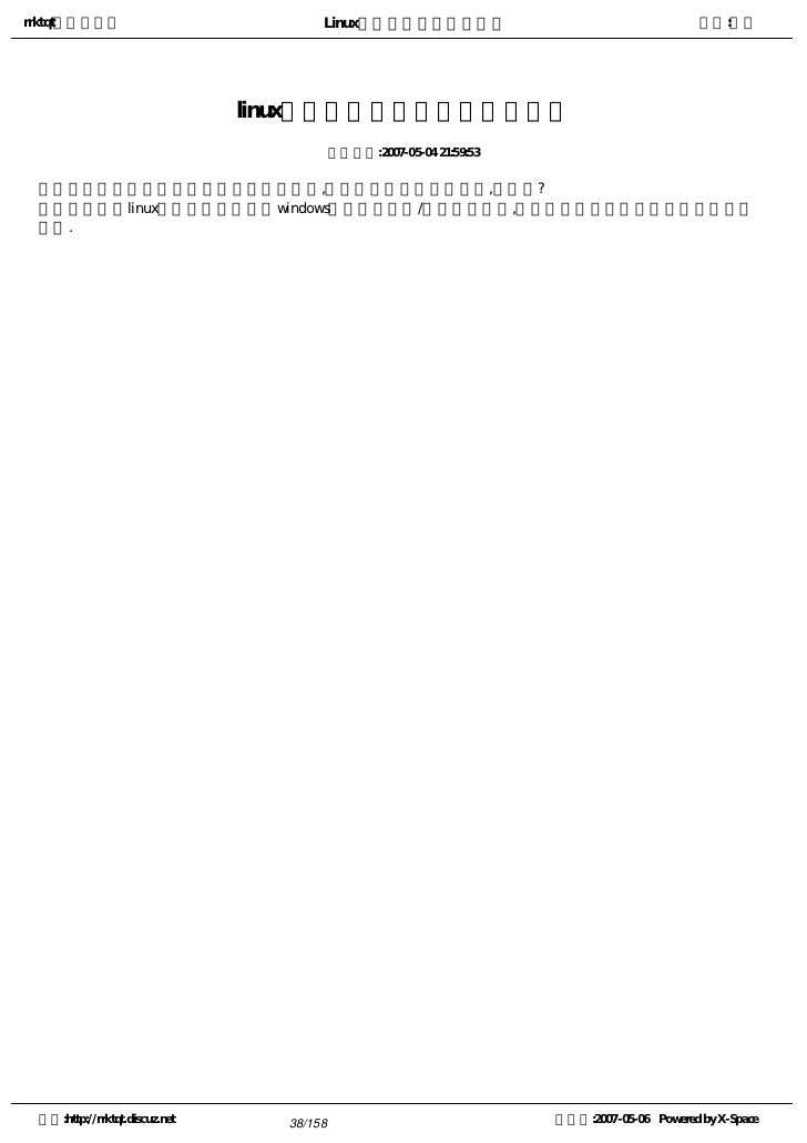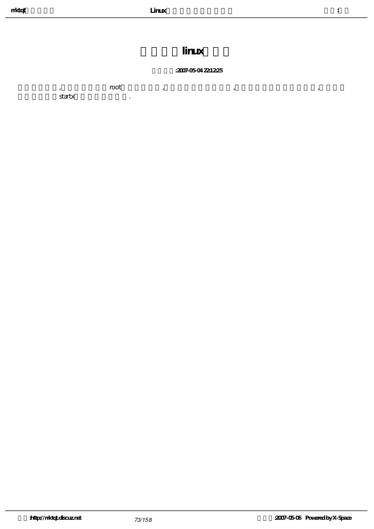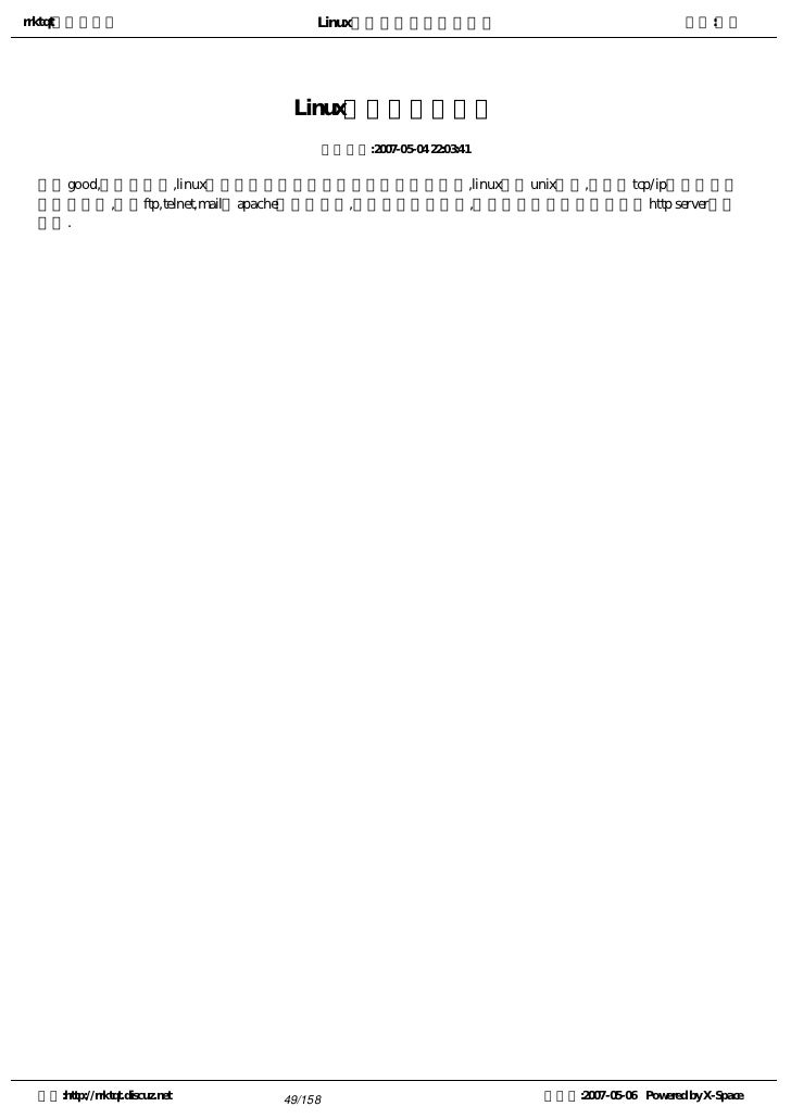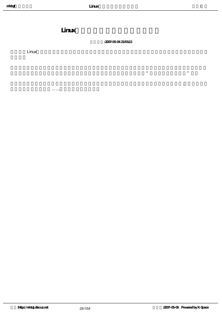 9. 9. rrktqt的个人空间 Linux实用培训教程第一部分 作者:红联 练成Linux高手教程(2.0系列) 发布时间:2007-05-05 12:02:53    Linux窗口管理器,它可以打开一个特殊的窗口,即为终端窗口(terminal),它将为用户提供一个标准的命 令行接口,用户可在窗口显示的提示符中输入带有选项和参数的命令。    看着别人操作那满屏幕的洋文,不可思议,那肯定是一个Linux高手,其实你也能成为高手中的一员。使 自己的Linux技能疯狂增长就必须学会操作与看懂这些洋文。   注:请选择您喜欢的格式,内容是一样的。   全程图解PDF格式下载地址:http://www.linuxdiyf.com/bbs/thread-34875-1-1.html   CHM格式下载地址:http://www.linuxdiyf.com/bbs/thread-35732-1-3.html   Linux培训系列(第一讲至第八讲,DPF格式)   下载地址:http://www.linuxdiyf.com/bbs/thread-35145-1-3.html 空间:http://rrktqt.discuz.net 9/158 制作于:2007-05-06 Powered by X-Space