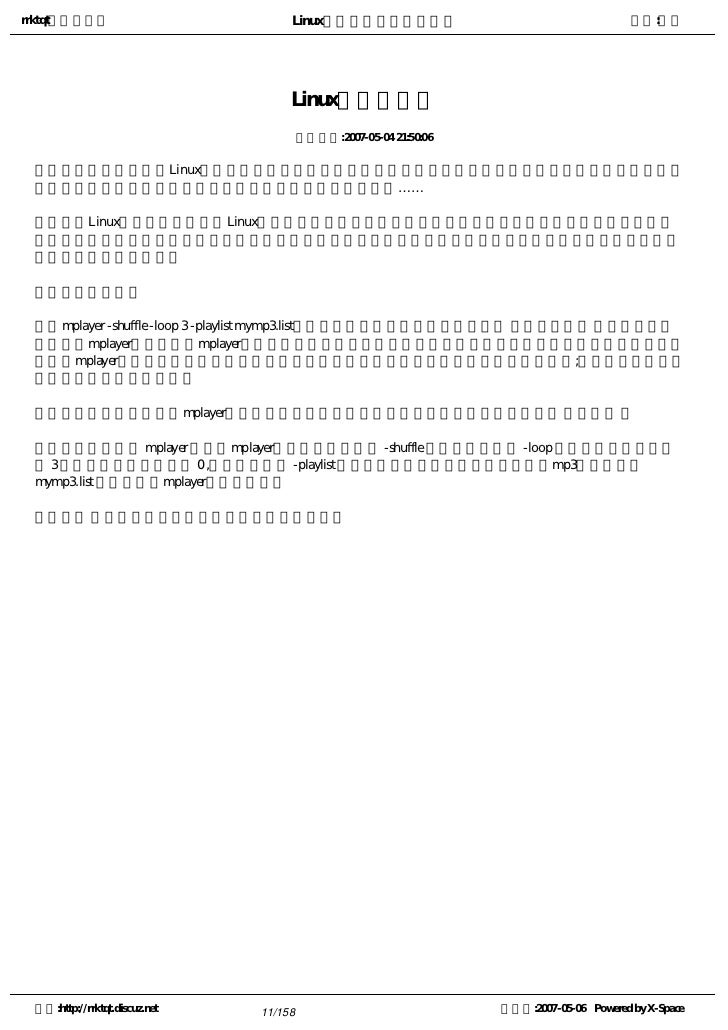 11. 11. rrktqt的个人空间 Linux实用培训教程第一部分 作者:红联 Linux程序、进程 发布时间:2007-05-04 21:50:06   或许您会这样想,Linux命令的句型确实不难,但是那么多命令,我怎么知道它们都是作什么的呢?而且不 同的系统中,可以使用的命令似乎也不太一样,这真让人困惑……   其实Linux的命令,运行的是Linux系统中的程序。只要您已安装了程序,您就可以通过命令来运行它,并 且可以使用参数来精细的调整它的运行状态。也可以通过点击启动图标来运行,不过启动图标不能够方便的调 整参数,并不是很方便。   举一个例子:   mplayer -shuffle -loop 3 -playlist mymp3.list可能您运行上面命令,系统会提示您 无法找到命令 ,那是因为您 没有安装mplayer这个程序。mplayer是我见过的支持格式最多的播放器,几乎任何已知格式的多媒体文件,都可 以使用mplayer来播放。它包含一个图形界面的前端,您可以在菜单中找到它,鼠标点击运行;也可以通过执行命 令来运行它的命令行版本。   如果您的系统中没有mplayer播放器,我们建议您安装一个。关于程序的安装,请参阅 软件安装 。   上面命令中, mplayer 调用了mplayer播放器程序。参数 -shuffle 表示随机播放, -loop 表示循环播放,后面 的 3 为循环的次数,如果为 0 ,则一直播放。 -playlist 表示播放列表中的曲目。我们可以把mp3的路径放到 mymp3.list 文件中,让mplayer来播放它们。   进程 为运行中的程序,是程序在内存中的镜像。 空间:http://rrktqt.discuz.net 11/158 制作于:2007-05-06 Powered by X-Space