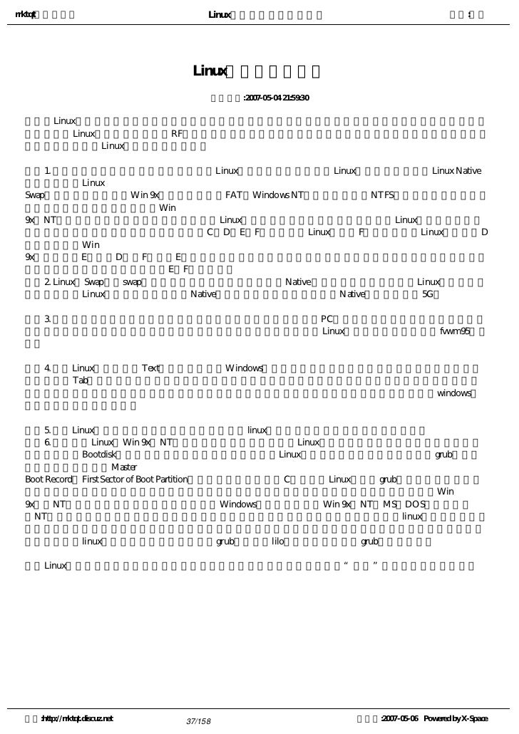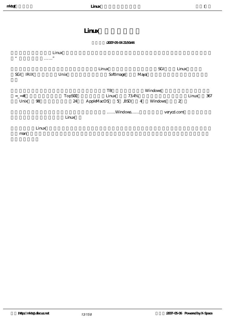 8. 8. rrktqt的个人空间 Linux实用培训教程第一部分 作者:红联   十,Linux的前景如何?   答:很多人都看好开源软件,看好Linux,它的前景肯定是光明的,建议你关注有关Linux新闻。   十一,有无好些的Linux学习书籍?   答:当然有,不过建议你到Linux社区发贴问问一些过来人,他们会给你推荐好的学习教程的。   十二,在哪可以购买到Linux或免费下载?   答:官方购买要保险些,可以邮购,当然一些软件店也可能有购,免费下载建议搜索,注意,由于文件较 大,应该选择速度快些的下。 空间:http://rrktqt.discuz.net 8/158 制作于:2007-05-06 Powered by X-Space