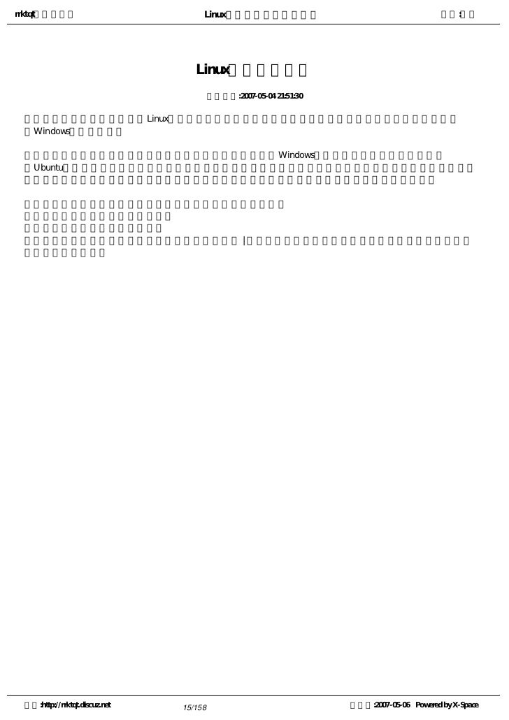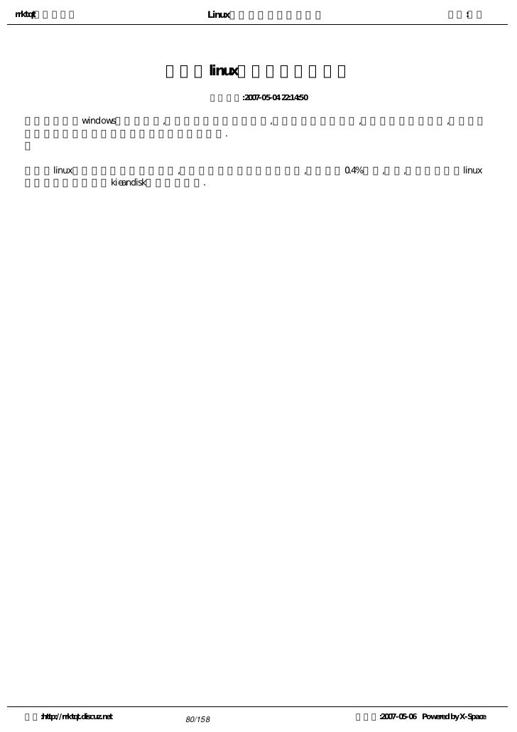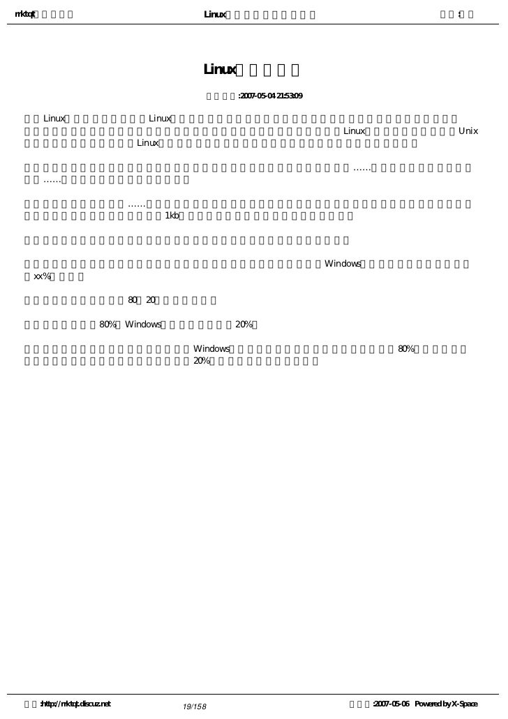 7. 7. rrktqt的个人空间 Linux实用培训教程第一部分 作者:红联 打消你对Linux的疑虑 发布时间:2007-05-04 21:49:18   或许你还没开始接触Linux就被一些网友的观点所吓住,很多人都说Linux操作难,这一点也不假,我承认 ,但我也希望你对Linux有一些认识。   下面的一些问答或许你会对Linux重新认识,如果你很想尝试Linux,你就不要太相信我说的,大胆去尝试 ,然后回过头来看我说的对不对?   一, Linux是不是高手的玩物?   答:不是,Linux在做服务器方面应用得广些,Linux在桌面应用上还需要工程师们努力的开发,这是句实 话,但它并不是高手们的玩物,高手有很多种,一个不懂Linux的人他对C++非常精通,他算是个高手吗?   二,是不是学好英文才能学好Linux?   答:命令行,一些操作,操作提示等等都是英文的,如果你不会英文也不要紧,安装个中文版的,不过为 了你能更深入学习还是建议你学点英文。   三,Linux对中文的支持如何?   答:总体来说,我国开发的如红旗Linux,中标Linux,共创Linux对中文支持较好,其它的虽然支持中文, 但显示效果还需要进一步优化。   四,Linux能满足我的办公需求吗?   答:没什么大问题,一般工具盘里都有满足你办公的软件。   五,Linux是不是经常出故障?   答:如果Windows一样也会出故障的话那Linux也会出故障的,但大多都是误操作引起的,也就是 说人为引 起的起的。请放心,只要你不对它破坏它就不会给你找麻烦。   六,我刚接触电脑,我能学习Linux吗?   答:能,学什么东西都是从一无所知到知的过程的。   七,我常常看到有的网友求助驱动硬件,Linux对硬件的兼容如何?   答:的确存在这种情况。不过只要你的硬件不是太新或太老一般都会兼容。当然,最好到官方去看看你所 要安装的版本是否能兼容你的硬件,好提前有个准备。   八,我想学Linux,但我的问题经常得不到解答?   答:这种情况的确是有的,但我相信很多热心网友都会帮助你的,当然我更建议你购买正式版得到技术支 持服务。   九,我不想学Linux,因为它对我不实用?   答:用哪个无所谓,实用对自己合适就行。 空间:http://rrktqt.discuz.net 7/158 制作于:2007-05-06 Powered by X-Space
