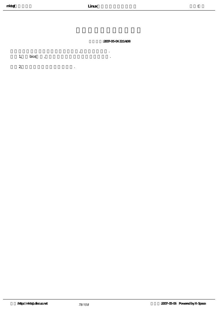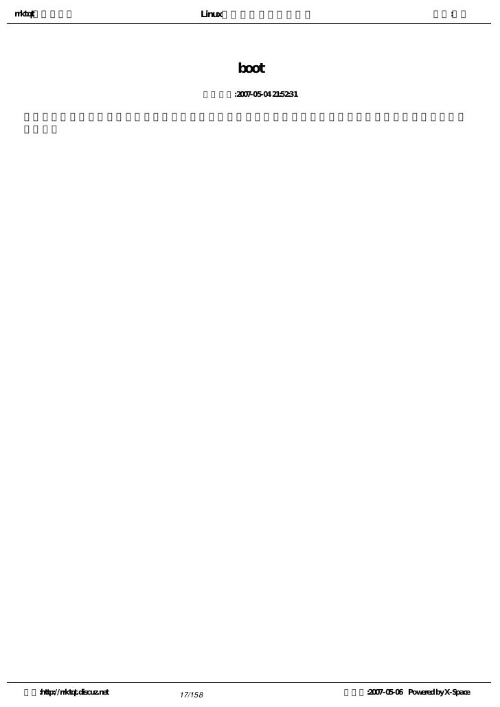 17. 17. rrktqt的个人空间 Linux实用培训教程第一部分 作者:红联 boot 发布时间:2007-05-04 21:52:31   引导。即发生在按下计算机的电源开关,机器开始检测接口设备的状态,并把操作系统加载到内存中的整 个过程。 空间:http://rrktqt.discuz.net 17/158 制作于:2007-05-06 Powered by X-Space