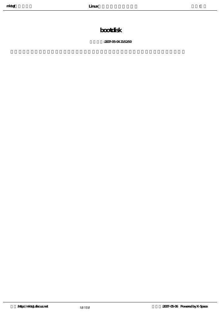 18. 18. rrktqt的个人空间 Linux实用培训教程第一部分 作者:红联 bootdisk 发布时间:2007-05-04 21:52:50   引导盘。包含来自硬盘(有时也可从其本身)加载操作系统的必要程序代码的可开机软磁盘。 空间:http://rrktqt.discuz.net 18/158 制作于:2007-05-06 Powered by X-Space
