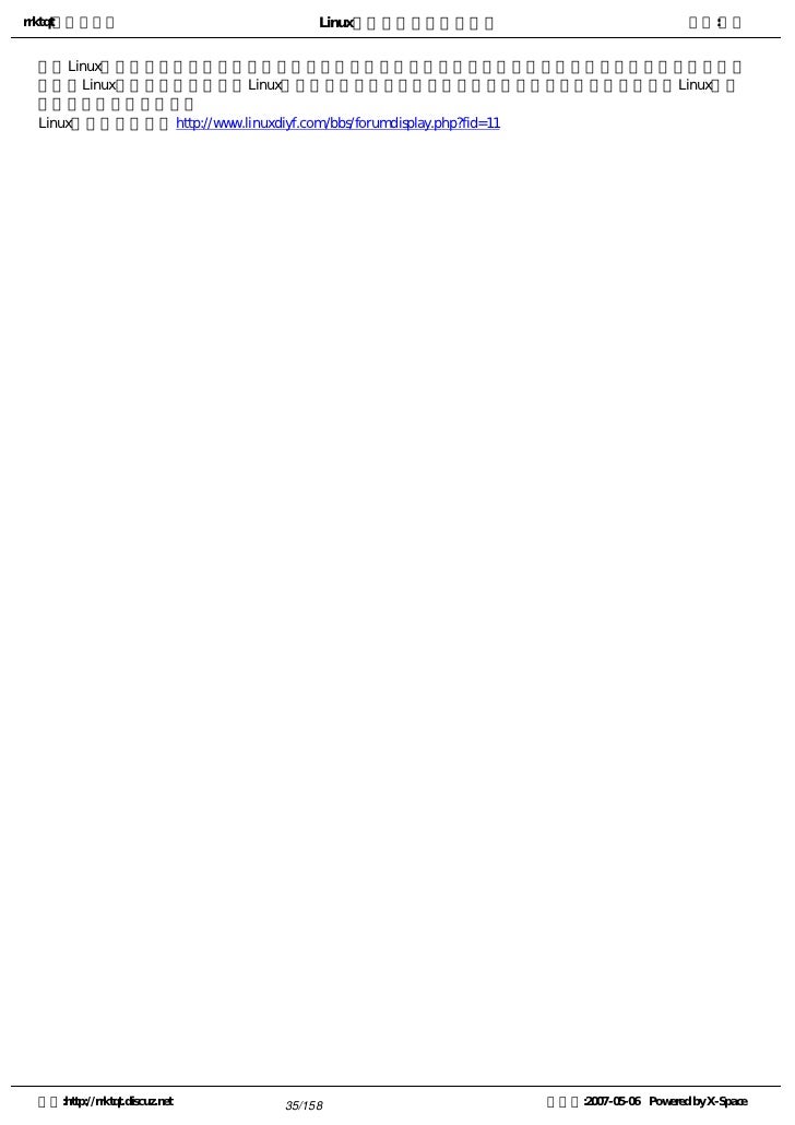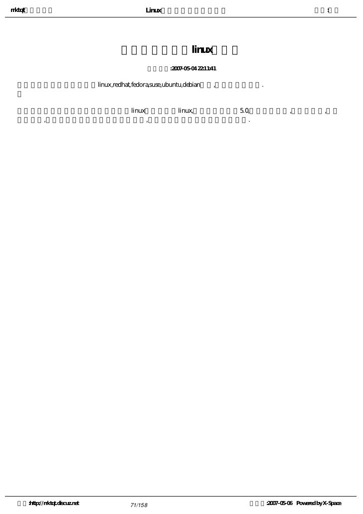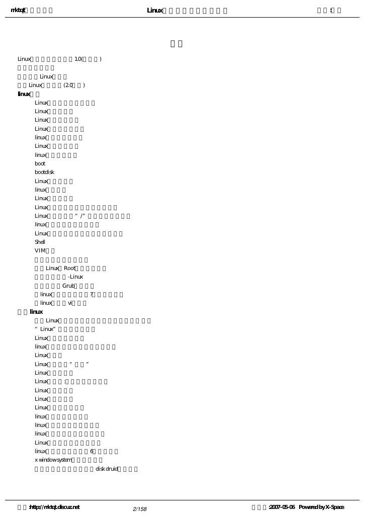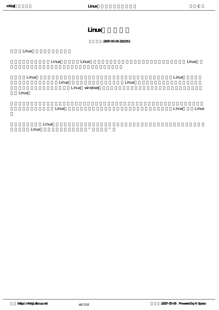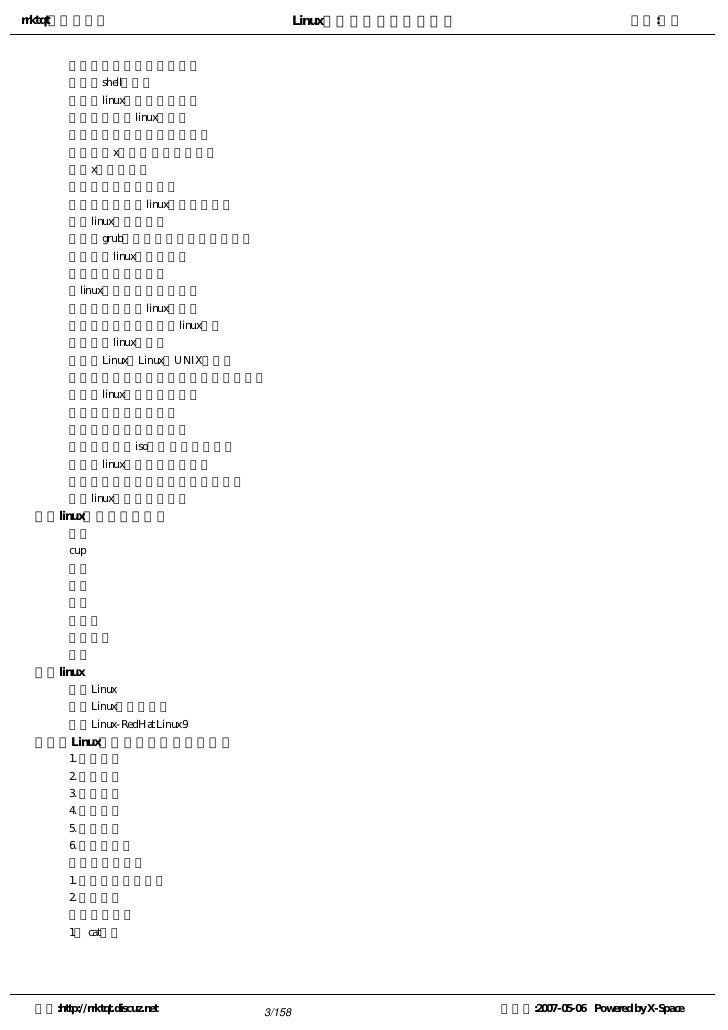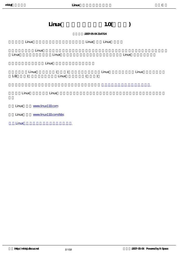 1. 1. rrktqt的个人空间 Linux实用培训教程第一部分 作者:红联 Linux实用培训教程第一 部分 ---------------共三部分   为广大Linux学习者制做的,本书内容基础,语言简短简洁,也节选了一些比较经典而且一定要了 解的Linux知识,循序渐进的介绍Linux相关知识,从入门到提高,希望对所有学习Linux的朋友都有帮 助。   本书主要包含了一些Linux基本技能及相关的操作技巧。内容基础,语言简短简洁   红联Linux论坛是致力于Linux技术讨论的站点,目前网站收录的文章及教程基本能满足不同水平 的朋友学习。   红联Linux门户: www.linux110.com   红联Linux论坛: www.linuxdiyf.com/bbs   下载:Linux电子书籍:   http://www.linux286.com/linux/linuxdzsj.htm 空间:http://rrktqt.discuz.net 1/158 制作于:2007-05-06 Powered by X-Space