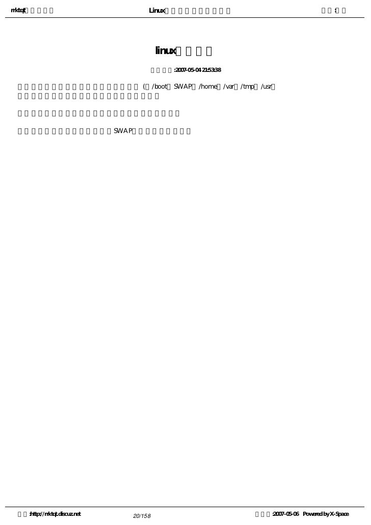 20. 20. rrktqt的个人空间 Linux实用培训教程第一部分 作者:红联 linux分区优化 发布时间:2007-05-04 21:53:38   访问率高的分区至于硬盘边缘位置; (如/boot、SWAP、/home、/var、/tmp、/usr等   访问率高的目录考虑创建单独的文件系统;   如果硬盘足够大,可保留部分硬盘空间以做备用;   有多个硬盘时,可采用多个SWAP提高交换分区性能; 空间:http://rrktqt.discuz.net 20/158 制作于:2007-05-06 Powered by X-Space