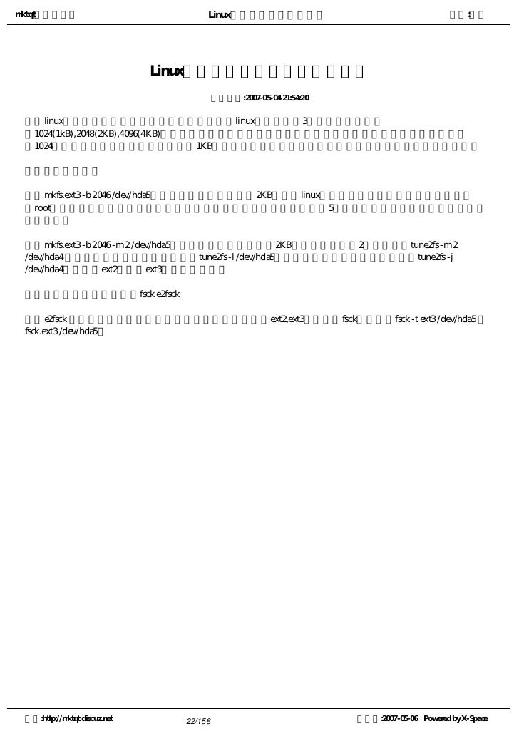22. 22. rrktqt的个人空间 Linux实用培训教程第一部分 作者:红联 Linux系统文件系统优化及磁盘检查 发布时间:2007-05-04 21:54:20   linux中数据块是储存数据的基本数据单元,在linux中可以设置3中数据块大小分别 是1024(1kB),2048(2KB),4096(4KB)。数据块大小决定了文件磁盘占有量,打个比方如果你设置了数据块大小 是1024,不管你的文件有多大,至少要占1KB的空间,所以可以根据存放文件的大小来合理设置数据块大小。   设置数据块:   mkfs.ext3 -b 2046 /dev/hda5,格式化并设置数据块为2KB。另外linux在每个分区都有保留块,这是专门留 给root用户及其所属组使用,别的用户是无法使用的,一般为总数据块的5%,但是如果你的磁盘大的话,就显 的浪费了。   mkfs.ext3 -b 2046 -m 2 /dev/hda5。格式化并设置数据块为2KB,设置保留块为2%。或者用tune2fs -m 2 /dev/hda4 这种方法不用格式化就可设置。tune2fs -l /dev/hda5,可以查看文件系统的详细信息,tune2fs -j /dev/hda4,可以将ext2转换为ext3而不损坏数据。   文件系统的检查工具:fsck e2fsck   e2fsck 用时有危险,不能很好的辨识文件系统,特别是ext2,ext3混用时。fsck得用法:fsck -t ext3 /dev/hda5 或 fsck.ext3 /dev/hda5。 空间:http://rrktqt.discuz.net 22/158 制作于:2007-05-06 Powered by X-Space