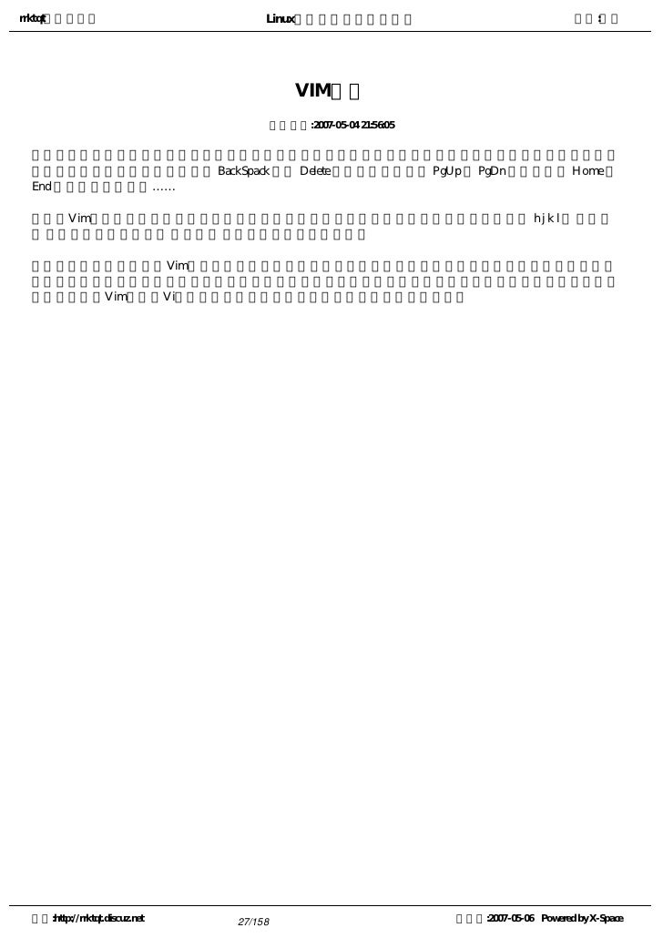 27. 27. rrktqt的个人空间 Linux实用培训教程第一部分 作者:红联 VIM简介 发布时间:2007-05-04 21:56:05   我们使用的大多数编辑器,都可以直接在编辑区输入字符,并且能够通过一些快捷键来完成一些控制功能 ,比如使用方向键移动光标,使用 BackSpack 或者 Delete 键删除文字,使用 PgUp 和 PgDn 翻页,使用 Home 和 End 来定位行首和行末……   而Vim是一个带模式的编辑器,同样的按键,在不同模式下,具有不同的功能定义。例如 h j k l 在 编辑模 式 下输入相应的字符,在 普通模式 下却相当于方向键的作用。   由于需要切换模式,Vim的使用起来略显繁琐。不过优点也显而易见:您只要把手安安稳稳的放在打字区 就可以了,而不需要使用诸如方向键、排版键、小键盘等需要挪开双手的键位,从而提高了您的效率和专注程 度。事实上,Vim的前身Vi诞生的时候,键盘上还没有方向键、排版键和小键盘。 空间:http://rrktqt.discuz.net 27/158 制作于:2007-05-06 Powered by X-Space