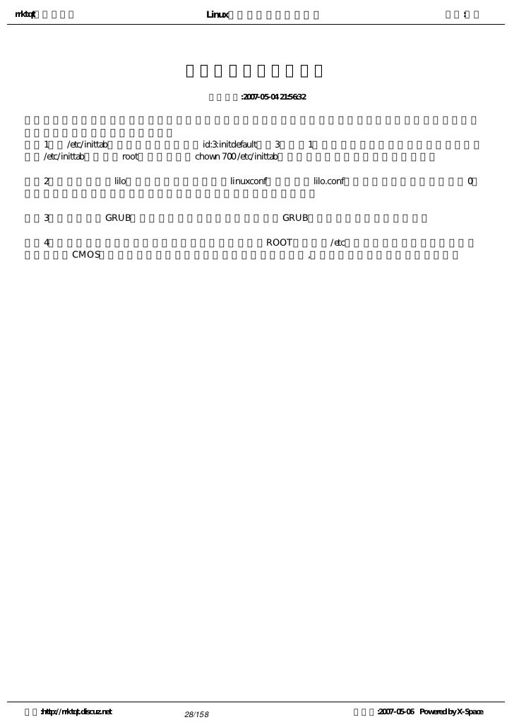 28. 28. rrktqt的个人空间 Linux实用培训教程第一部分 作者:红联 防止进入单用户的方法 发布时间:2007-05-04 21:56:32   由于单用户对系统有完全的控制权限,如果操作不当或被他人进入,那么后果将不堪设想,如何防止入行 单用户了,有以下几个注意的方面。   1、对/etc/inittab文件进行保护,如果把id:3:initdefault中的3改为成1,就可以每次启动直接进入到单用户方式 。对/etc/inittab文件,以root身份进入通过chown 700 /etc/inittab把属性设为其它用户不能修改就行了。   2、如果是使用的lilo方式进行引导,可能通过linuxconf或直接修改lilo.conf把引导时等待输入时间设置为0或 最短时行。这种情况下,如果进入单用户方式,可以用软盘进行引导。   3、如果使用是GRUB方式进行引导,最简单的方法是使用GRUB密码,对启动选项进行保护。   4、为了防止他人远程进行破坏,使系统重启,除了对ROOT的密码和/etc目录下的文件进行有效管理之外 ,还应当对CMOS进行密码设置,这样即使把系统改成单用户方式了,也无法直接的启动计算机进行操作。 空间:http://rrktqt.discuz.net 28/158 制作于:2007-05-06 Powered by X-Space