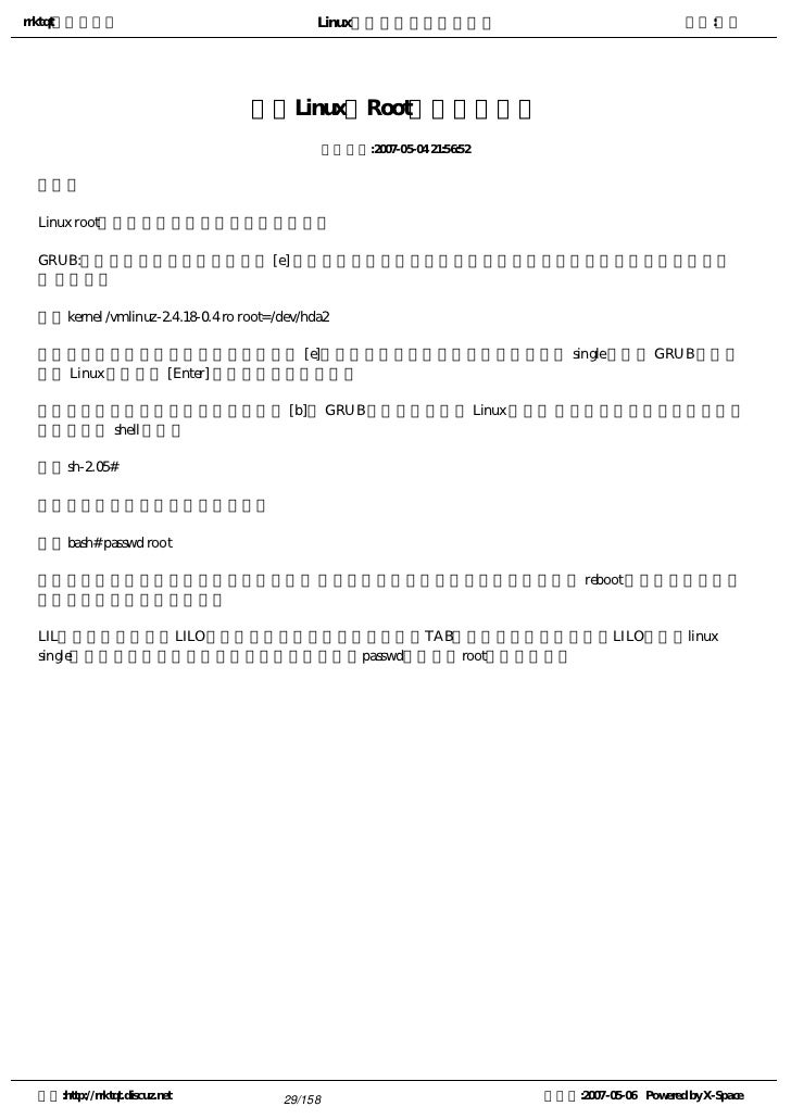 29. 29. rrktqt的个人空间 Linux实用培训教程第一部分 作者:红联 解决Linux的Root密码丢失问题 发布时间:2007-05-04 21:56:52 简介: Linux root密码丢失了怎么办?给你一个方法。 GRUB:在引导装载程序菜单上,键入 [e] 来进入编辑模式。你会面对一个引导项目列表。查找其中类似以下输 出 的句行:   kernel /vmlinuz-2.4.18-0.4 ro root=/dev/hda2 按箭头键直到这一行被突出显示,然后按 [e]。你现在可在文本结尾处空一格再添加 single 来告诉 GRUB 引导单 用户 Linux 模式。按 [Enter] 键来使编辑结果生效。 你会被带会编辑模式屏幕,从这里,按 [b], GRUB 就会引导单用户 Linux 模式。 结束载入后,你会面对一个与 以下相似的 shell 提示:   sh-2.05# 现在,你便可以改变根命令,键入:   bash# passwd root 你会被要求重新键入口令来校验。结束后, 口令就会被改变,你便可以在提示下键入 reboot 来重新引导;然后 ,象平常一样登录为根用户。 LIL当系统启动到出现LILO引导画面时,对于图形引导方式按TAB键进入文本方式,然后在LILO处输入linux single回车即可进入免密码的控制台,进入以后使用passwd命令修改root的密码即可。 空间:http://rrktqt.discuz.net 29/158 制作于:2007-05-06 Powered by X-Space