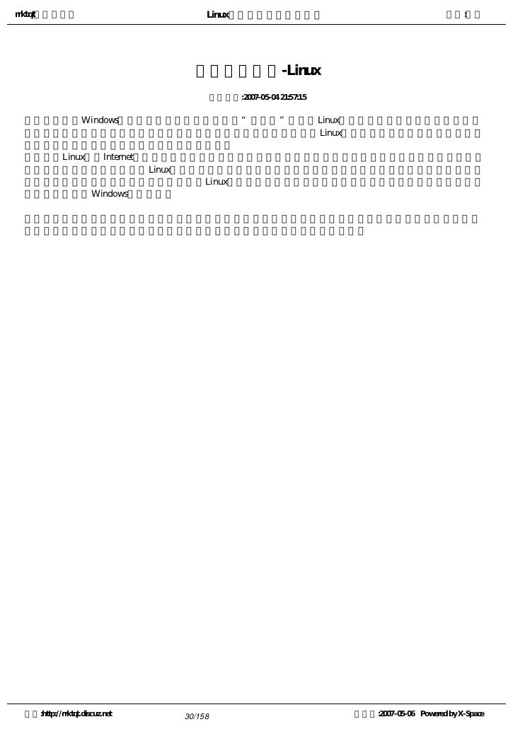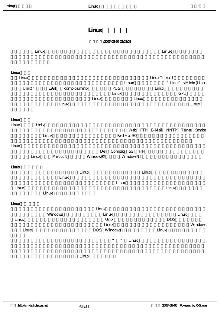 30. 30. rrktqt的个人空间 Linux实用培训教程第一部分 作者:红联 网络操作系统-Linux 发布时间:2007-05-04 21:57:15   对微软的Windows操作系统霸主地位形成挑战的“小企鹅”---Linux日益普及,在面临着巨大压力的小 企鹅在网络技术日益发展的今天蓬勃发展,它越来越受到用户的青睐。Linux最大的优点在于其作为服务器的强 大功能,这也是众多用户选择使用它的根本原因。   由于Linux通过Internet协同开发,随着它健壮和稳定的网络功能不断壮大,毫无疑问它将越来越成为一种纯 正的网络操作系统。最近几年Linux不但在服务器方面加强而且在桌面版上也毫无逊色,这只被认为是小企鹅的 操作系统正悄悄的走进用户的电脑中,由于Linux标榜自由和开放,所以我们有理由相信它有可能在近年内击败 当今霸主地位的Windows操作系统。   网络已成为人们生活当中信息来源不可缺少的一部分,网络的安全是每位用户必须了解的常识,可见人们 追求的操作系统不仅仅是新鲜、易用,更多的是安全、稳定、高效、免费、开源。 空间:http://rrktqt.discuz.net 30/158 制作于:2007-05-06 Powered by X-Space