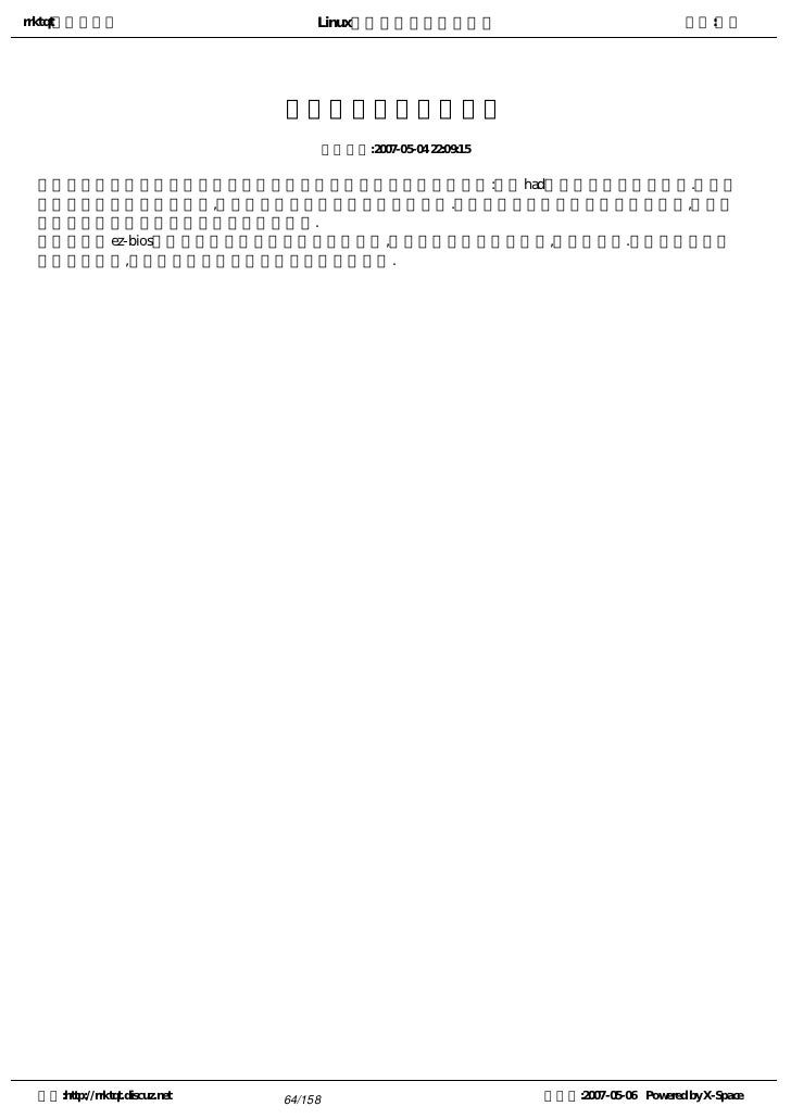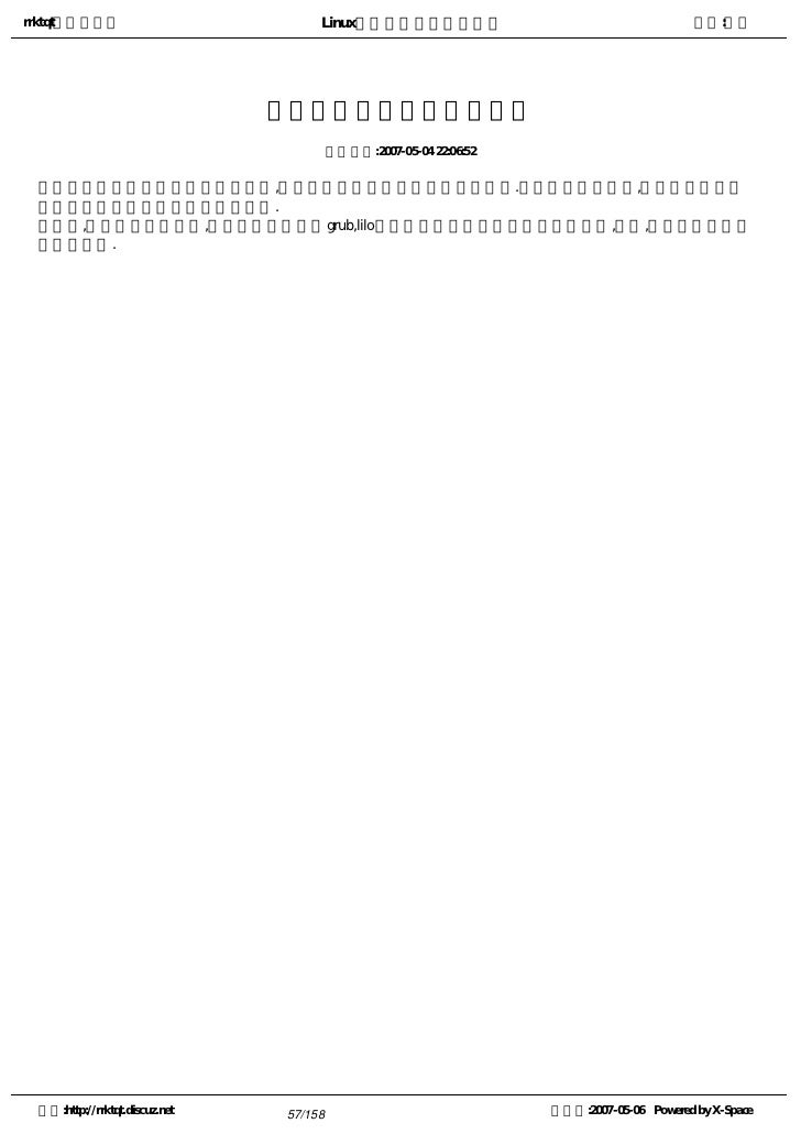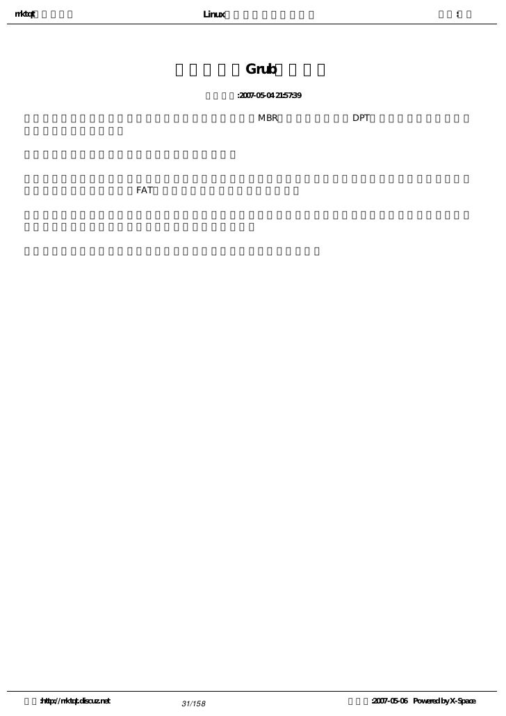 31. 31. rrktqt的个人空间 Linux实用培训教程第一部分 作者:红联 引导管理器Grub硬件基础 发布时间:2007-05-04 21:57:39   一块硬盘,它起始的一部分扇区为主引导扇区,包括MBR(主引导纪录)和DPT(分区表,您可以阅读分 区概念章节中相关内容)   每个分区起始的一部分扇区,为分区引导扇区。   在分区引导扇区之后的部分,为文件系统的索引,文件系统通过它定位文件在硬盘上的位置。不同的文件 系统采用不同的索引,例如FAT文件系统使用文件分配表和目录区。   绝大多数操作系统,对硬盘的读写操作,通过文件系统来完成,因此引导扇区中的内容,我们不能够在文 件系统中进行操作,而需要专用软件,比如引导管理器。   我们对文件进行修改后,操作系统会将文件系统索引中的内容同步。 空间:http://rrktqt.discuz.net 31/158 制作于:2007-05-06 Powered by X-Space