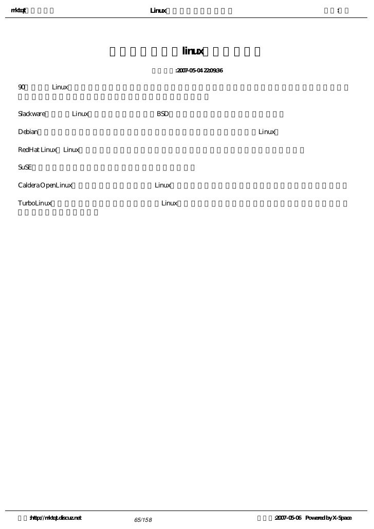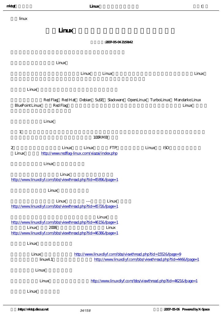 34. 34. rrktqt的个人空间 Linux实用培训教程第一部分 作者:红联 接触linux 加入Linux阵营初期:初学者常问的八大问题解疑 发布时间:2007-05-04 21:58:42 注:以下链接需要你联网,如果你不能访问下列链接,很抱歉。 问题一,我是否适合学习Linux? 答:可以这么说,每位朋友都适合学习Linux,因为Linux可以胜任用户日常学习,工作,娱乐的需求。Linux下 有很多的软件,而且操作简便,最大的优点在于其作为服务器的强大功能。 问题二,Linux的发行版有哪些,哪个发行版较适合初学者? 答:常见的主要有Red Flag,Red Hat,Debian,SuSE,Slackware,OpenLinux,TurboLinux,Mandarke Linux ,BluePoint Linux等等,Red Flag是由北京中科红旗软件技术有限公司开发的,界面美观友好,是Linux中支持中 文最好的版本,推荐初学者采用。 问题三,如何获取Linux? 答:1,购买正版发行的软件:一般来说,这样的软件质量有保证,有售后服务,用起来放心,正版软件大多 配套有系统全部光盘及安装手册齐全,价格在100RMB左右。 2,从网站上免费下载:大多Linux产商及Linux爱好者的FTP网站上都提供有Linux安装ISO映像文件下载,红 旗Linux下载点:http://www.redflag-linux.com/xiazai/index.php 问题四,如何安装Linux及相关注意事项? 答:详见:黄金海岸线:把Linux安装在爱机上与基础知识 http://www.linuxdiyf.com/bbs/viewthread.php?tid=4589&fpage=1 问题五,如何去学习Linux,应该学些什么? 答:详见:黄金海岸线:Linux学习方法论---为您学习Linux指明方向 http://www.linuxdiyf.com/bbs/viewthread.php?tid=4572&fpage=1 学习方法详见:一招让你拥有一张属于自己学习Linux的王牌 http://www.linuxdiyf.com/bbs/viewthread.php?tid=4615&fpage=1 终极学习Linux之术:2006年找一位异性朋友一起学习Linux http://www.linuxdiyf.com/bbs/viewthread.php?tid=4638&fpage=1 问题六,Linux都有哪些应用软件? 答:详见:Linux下的常用软件列表http://www.linuxdiyf.com/bbs/viewthread.php?tid=1552&fpage=9 这是集成在红旗linux4.1前三张盘里的应用软件http://www.linuxdiyf.com/bbs/viewthread.php?tid=446&fpage=1 问题七,学习Linux的资源有哪些? 答:详见:学习Linux的良师,高手的缔造者http://www.linuxdiyf.com/bbs/viewthread.php?tid=4621&fpage=1 问题八,Linux的前景如何? 空间:http://rrktqt.discuz.net 34/158 制作于:2007-05-06 Powered by X-Space
