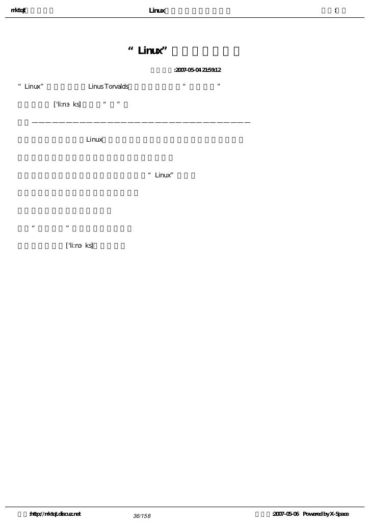 36. 36. rrktqt的个人空间 Linux实用培训教程第一部分 作者:红联 “Linux”正确读音及音标 发布时间:2007-05-04 21:59:12 “Linux”这个单词根据Linus Torvalds本人的发音应该是“哩呐克斯”   音标是 ['li:nэks] 重音在“哩”上   ————————————————————————————————   以上结论来自红旗Linux技术支持部及一个从事网络安全工作多年的网友   上面是原话,他们答案是一致的当然也是权威的   主要是因为看见几位大侠级别的兄弟把“Linux”读错了   并且把错误的读音教给了新来的朋友   所以就想着去问问正确读音   “哩呐克斯”只是根据发音翻译的   请大家按照['li:nэks]这个音标读 空间:http://rrktqt.discuz.net 36/158 制作于:2007-05-06 Powered by X-Space