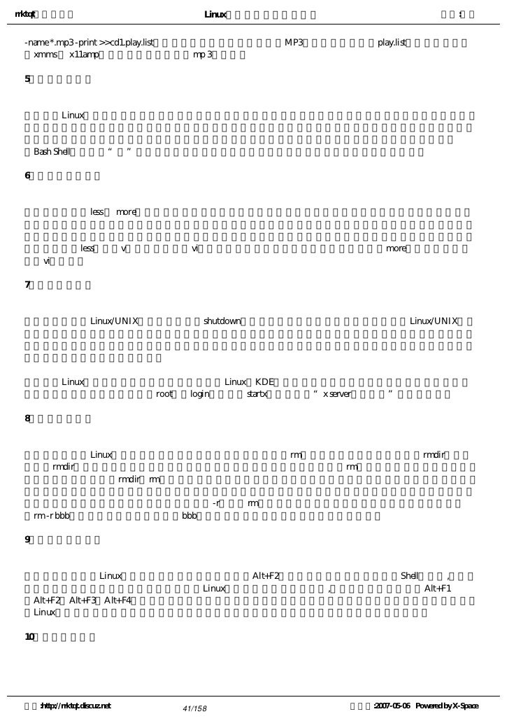 41. 41. rrktqt的个人空间 Linux实用培训教程第一部分 作者:红联 -name *.mp3 -print >>cd1.play.list,这样就会把指定目录中的所有MP3文件建立一个名为play.list的文件。然后使 用xmms 或 x11amp命令就能进行播放这些mp 3音乐了。 5、快速输入命令   由于Linux操作界面大部分都是处于命令行输入状态,因此要想执行某个功能的话,可能需要输入一段很长 的命令字符,如果在实现某个功能中需要重复好几遍这样的命令,那么我们还是这样一个字符一个字符地输入 ,肯定是比较麻烦的,那么我们有没有办法来快速输入以前用过的命令呢?答案当然是肯定的,我们可以 在Bash Shell中,使用“!”来重复上几次输入过的命令,这样就可以省去重新输入命令的麻烦了。 6、快速启动编辑器   我们在使用less 或 more命令来查看某个文件时,可能会发现被查看的文件有错误或者其他需要修改的内容 ,这时我们就需要对其进行修改,但是在查看状态下,我们无法直接对该文件进行任何编辑工作,必须另外启 动编辑器才可以进行编辑,那么在这种状态下,我们该采取什么方法才能快速启动编辑器呢?其实操作很简单 ,我们只要在less中打入v键,会立即启动vi或其他你在环境变量中指明的编辑器,但是在more方式中我们只能 使用vi命令了。 7、快速关闭系统   旧版本的的Linux/UNIX系统必须先运行shutdown命令,然后才能关闭电源,但最新版本的Linux/UNIX系统 已经在这个方面作了很大的改进,再也没有必要象以前那样关机了。因为新版本借鉴了大型机的技术,采用了 抗掉电的日志式文件系统,可以自动跟踪保存用户数据、自动同步刷新文件系统,用户完全可以随手关闭电源 ,从而达到快速关闭系统的目的。   如果Linux不正常关机,有可能导致不能进入Linux的KDE环境而只能处于控制台环境下,而且不断地有大 片大片的英文字符向上翻滚。以root身份login后,键入startx命令,出现“x server不能连接”的错误提示。 8、快速删除文件   我们知道在Linux字符界面中,要删除一个文件的话可以使用rm命令,删除一个目录可以使用rmdir命令。 但由于rmdir命令只能删除空白的目录,假使某个目录下面有文件,就只能先用rm命令来把目录中的文件删除掉 才可以,所以通常需要rmdir与rm这两个命令配合使用才能彻底删除一个完整的目录。但用这种方法来对付几级 子目录还能凑合,如果一个目录中含有若干个子目录,而且这若干子目录中又包含了若干级子目录,再使用这 种方法不把你累死才怪。现在我们可以使用带-r参数的rm命令来删除一个非空目录,例如我们在命令行中输 入rm -r bbb这样的命令,表示系统将把bbb目录中包含的所有文件和子目录全部删除掉。 9、快速访问操作台   当我们登录进Linux系统后,如果再按一下键盘上的Alt+F2键,这时我们又可以看到一个Shell提示符,其实这 个就是第二个虚拟操作台。通常,新安装的Linux系统共有四个虚拟操作台,我们可以分别用复合键Alt+F1 、Alt+F2、Alt+F3、Alt+F4来访问它们。使用虚拟操作台频率最多的地方就是,当某一个程序出错锁住输入时或 者Linux系统突然失去响应时,就可以切换到其他虚拟操作台登录进入后杀掉这个出错的进程任务。 10、快速解压文件 空间:http://rrktqt.discuz.net 41/158 制作于:2007-05-06 Powered by X-Space