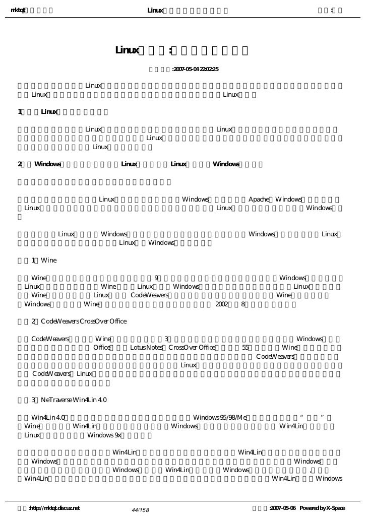 44. 44. rrktqt的个人空间 Linux实用培训教程第一部分 作者:红联 Linux初学者:入门时的五个问题 发布时间:2007-05-04 22:02:25 很多计算机用户虽然对Linux早有耳闻,但因为对其知之甚少,以至于虽然想进一步了解,但苦于无从下手。下 面是Linux初学者最容易问到的五个问题和答案,也许它可以帮你步入Linux之门。 1:哪些Linux发行版支持中文?   这是想要尝试使用Linux的用户问得最多的问题之一。事实上,Linux本身就支持世界上所有主要的语种, 中文当然也支持了。一般而言,几乎所有的Linux发行版在安装开始时都会要求选择所要使用的语言,只要在此 选择了中文,那么安装的Linux就是中文版了。 2:在Windows下可以运行任意一个Linux程序吗?在Linux下能运行Windows程序吗?   因为这是两个独立的问题,所以我要分开回答。   有一些程序最初产生于Linux之下,后来才被导入到Windows之中的,比如Apache。Windows并不能直接运 行Linux环境下的可执行程序,需要有一个移植的过程。也就是说,Linux应用程序不能直接运行于Windows之下 。     那么Linux能否运行Windows下的程序呢?在一些辅助程序的帮助下,Windows下的程序可以在Linux下 运行。下面就简单介绍一下可以让Linux运行Windows程序的工具。   1.Wine   Wine不是一个模拟器,是一个已经创建有9年之久的项目。其创建的初衷是为了实现Windows下的应用程序 和Linux操作系统的兼容性。Wine 可以在Linux上运行Windows程序,并且使之看起来像真正的Linux本地程序一 样。Wine是免费的,它由Linux社区和 CodeWeavers来负责开发和维护工作。用户在使用Wine时,并不需要 有Windows许可。有关Wine的具体用法,请参见《开放系统世界》 2002年第8期上的相关文章。   2.CodeWeavers CrossOver Office   CodeWeavers主要是对Wine进行了改进。经过3年的努力,现在它已经可以很好地运行很多Windows下的常 用程序,其中包括微软的 Office套件和Lotus Notes。CrossOver Office的售价是55美元。它与Wine相比,最大的优 点是大大降低了安装和配置的难度。当然,在决定购买之前,还应该先查看一下 CodeWeavers的兼容列表页面 ,看一看你所需的关键应用程序是否可以成功地运行于Linux之下。需要提请注意的是,有的应用程序虽然可以 通过 CodeWeavers在Linux下运行起来,但应用程序的一些功能无法实现。有的应用程序需要在安装的过程中进 行一些特殊的配置才能被支持。   3.NeTraverse Win4Lin 4.0   Win4Lin 4.0是一个模拟器,它实际上是为机器上现有的Windows 95/98/Me操作系统创建一个“容器”。 和Wine不同的是,Win4Lin需要系统上有一个完整的Windows操作系统。因此,在安装完 Win4Lin之后,还要 在Linux机器上安装一个Windows 9x操作系统。   听起来似乎很复杂,实际上Win4Lin把整个安装过程设计得非常简单。Win4Lin的缺点之一就是因为要安装 一个Windows副本,所以占用的磁盘空间比较大。当然其优点也是显而易见的,它可以运行的Windows下的运 用程序数量非常多。不过,在其Windows屏幕中,Win4Lin只允许运行Windows下的应用程序。因此,我建议 把Win4Lin运行于一个虚拟桌面上,这样就可以避免一些潜在的问题。值得一提的是,Win4Lin允许从Windows 空间:http://rrktqt.discuz.net 44/158 制作于:2007-05-06 Powered by X-Space