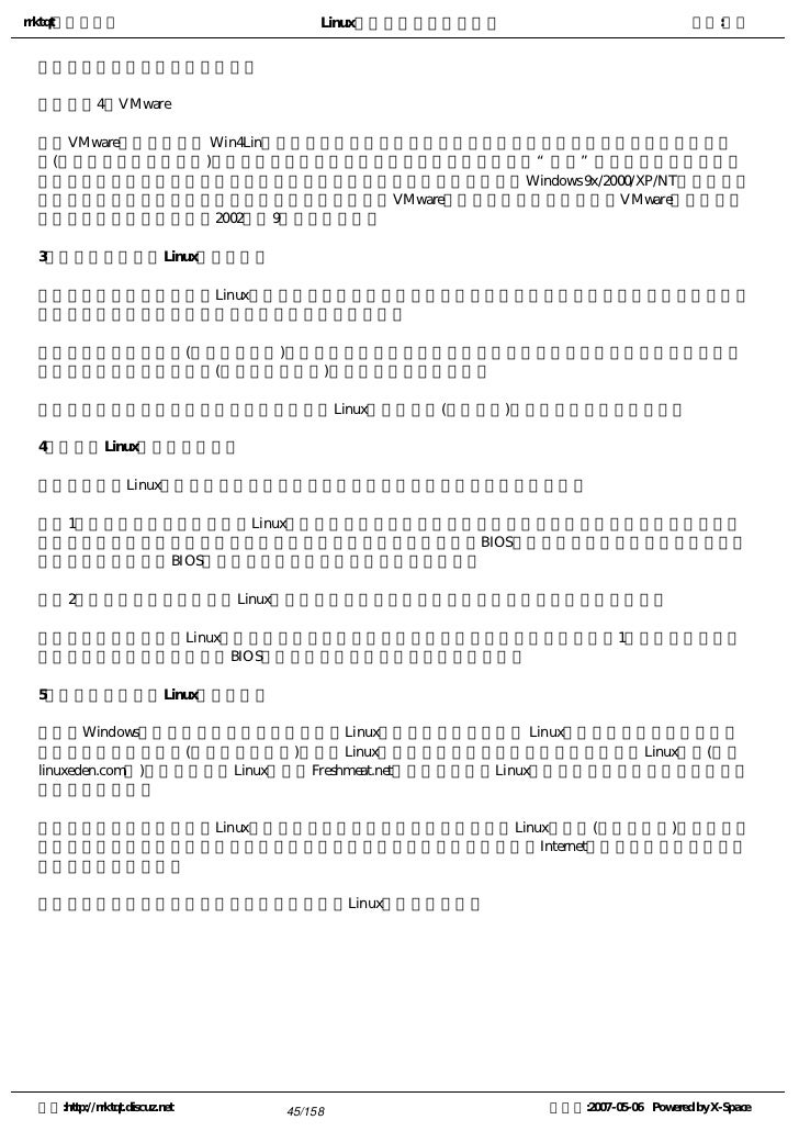 45. 45. rrktqt的个人空间 Linux实用培训教程第一部分 作者:红联 应用程序中进行剪切、粘贴操作。     4.VMware   VMware看起来似乎和 Win4Lin相似,但实际上无论从支持的程序数量上还是价格上来看,它们都有所不 同(该软件也可以免费下载)。它的设计目的是可以在一台计算机上创建一个多“客户”的操作系统环境。也就 是说,它可以在一台机器上运行一个或者多个操作系统,这些操作系统包括Windows 9x/2000/XP/NT等。对于那 些需要在不同的平台上测试自己程序的开发人员而言,VMware也是一个不错的选择。有关VMware的具体用法 ,请参见《开放系统世界》2002年第9期的相关文章。 3:从何处可以获得Linux入门指南?   几乎所有大的书店都有Linux书籍的专柜,其中有很多书就是专门针对初学者的。如果所在地没有卖这样的 书也没有关系,可以从网上书店购买相关的书籍和资料。   如果你是从零售商(连邦、卓越等)处购买的发行版,一般都会有一本非常不错的入门教材。从最新的几个 发行版来看,国内的发行版(比如红旗、中软)提供的资料要更好一些。   当然,最好的办法就是从网上下载,有关Linux方面的资料(无论深浅)在网上可以说是应有尽有。 4:如何将Linux安装在系统上?   要把一个Linux发行版安装在系统上有很多种途径,我这里只介绍最简单的两种:   1.从零售商或者朋友处得到Linux的安装盘,将其放入光驱中,重新启动系统。如果系统从光盘启动,那 么只需按照屏幕提示完成安装即可。如果没有从光驱启动,就要设置BIOS,重新设定启动设备的顺序,把光驱 置于最前。如果你的BIOS不支持从光驱启动,就不能使用这种方法。   2.从局域网的机器上安装Linux。因为各发行版安装有所不同,所以具体方法可到网上查看。   当然,实际上安装Linux还有其它几种方法,不过都不太适合初学者。我个人认为方法1是最简单的,并且 一般来说,现在机器都支持从BIOS启动,所以建议初学者采用第一种方法。 5:从何处可以获得Linux应用程序?   和Windows操作系统一样,可以从网上发现Linux应用程序。不过,由于 Linux在国内流行的时间不长,很 多专业提供下载的网站(比如华军软件园)提供的Linux程序还是比较有限。你可以从很多专业的Linux网站(比如 linuxeden.com等)下载到相应的Linux程序。Freshmeat.net是一个专门提供Linux下应用程序的网站,不过其说明和 介绍都是英文的。   当然,最好的办法是从Linux发行版光盘上寻找需要的程序。所有商业Linux发行版(包括红旗等)其发行版中 都附有数百个应用程序,涉及领域更是相当的广,其中包括办公、图像处理、Internet应用、游戏等,几乎所有 日常所需的内容都有。   这五个问题回答完了,希望能对初学者步入Linux之门有所帮助。 空间:http://rrktqt.discuz.net 45/158 制作于:2007-05-06 Powered by X-Space