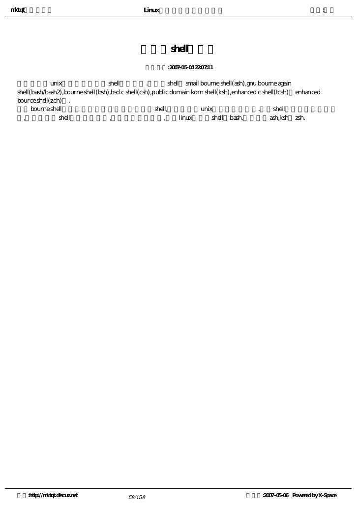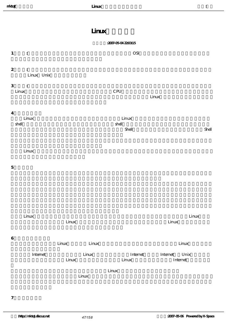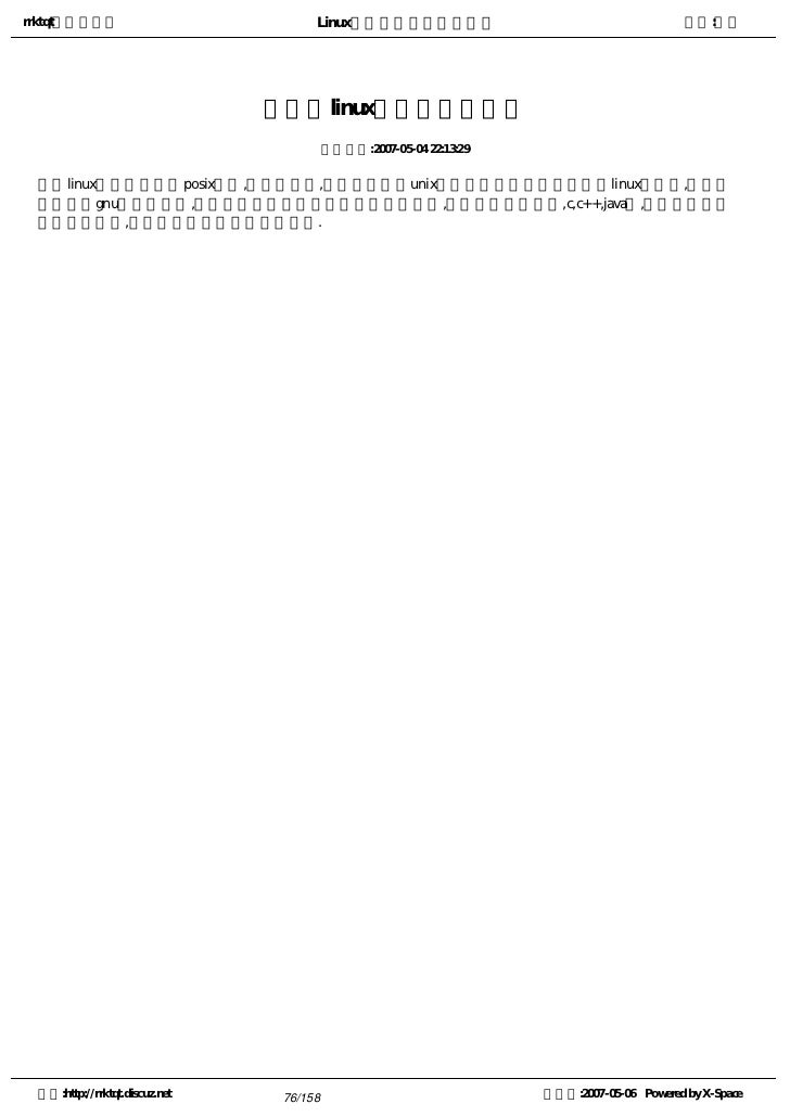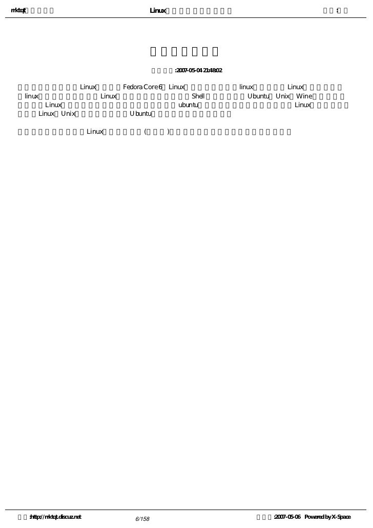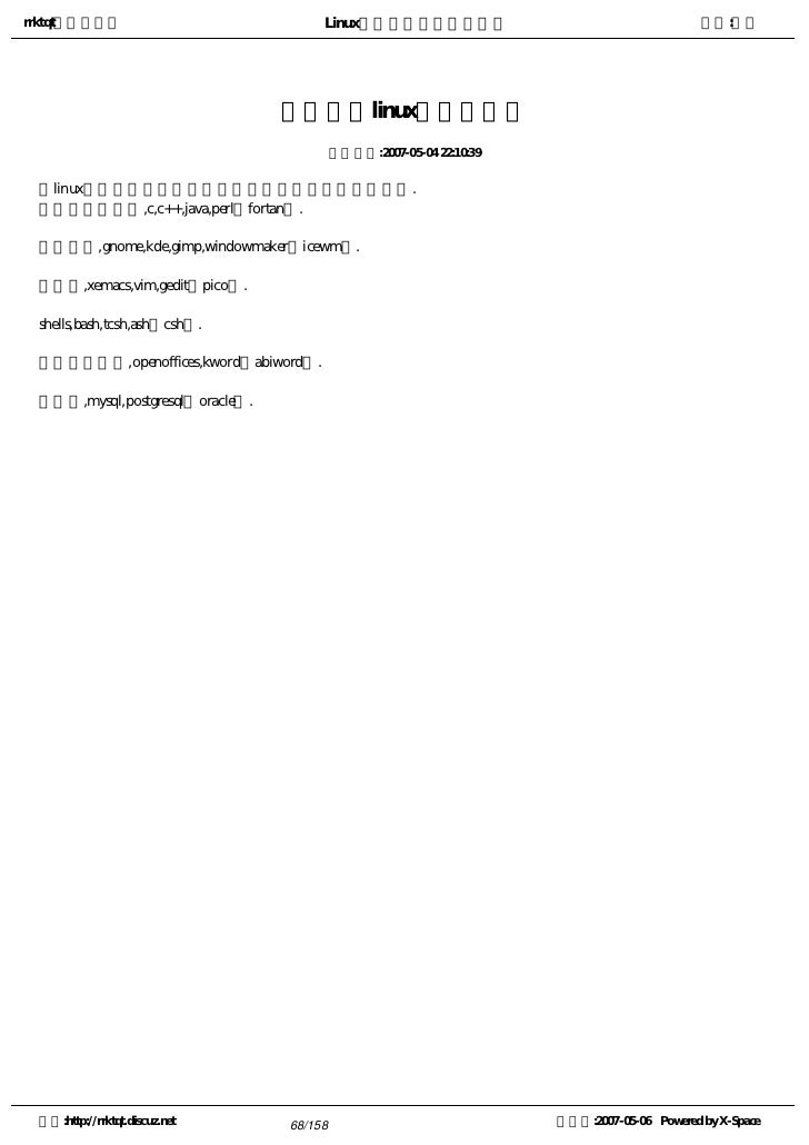 4. 4. rrktqt的个人空间 Linux实用培训教程第一部分 作者:红联 2) more命令 3) less命令 学前补课 Linux高手是怎样“练”成的 Linux认知存在十大误区 Linux系统学习方法论 为您学习Linux指明方向 基于Linux的学习方法 你想知道:LINUX适合你吗?我来告诉你 入门级学习:linux学习方向和方法浅谈 使用Linux的十大理由 系统学习Linux11点建议 想知道Linux到底能做什么的进来 学习Linux的良师,高手的缔造者 学习Linux的七点忠告 循序渐进学习LINUX之特性综述 也谈LINUX的学习方向及学习方法 一封写给MM学习linux的信 一招让你拥有一张属于自己学习Linux的王牌 中小企业Linux应用之惑 终极学习Linux之术 转用Linux的25条理由 作好安装Linux的准备 Linux海量教程 空间:http://rrktqt.discuz.net 4/158 制作于:2007-05-06 Powered by X-Space