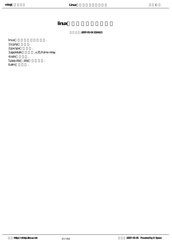 51. 51. rrktqt的个人空间 Linux实用培训教程第一部分 作者:红联 linux系统支持的协议有哪些 发布时间:2007-05-04 22:04:22 linux内核支持以下主要协议. 1,tcp/ip通信协议. 2,ipx/spx通信协议. 3,appletalk通信协议,x.25,frame-relay. 4,isdn通信协议. 5,ppp,slip和plip等通信协议. 6,atm通信协议. 空间:http://rrktqt.discuz.net 51/158 制作于:2007-05-06 Powered by X-Space