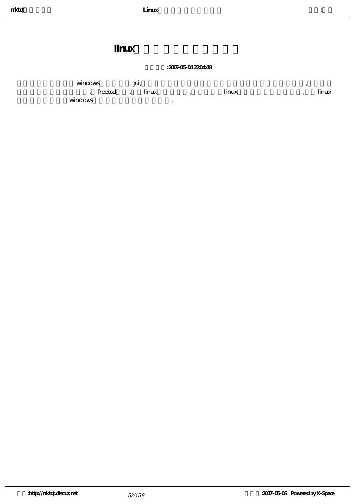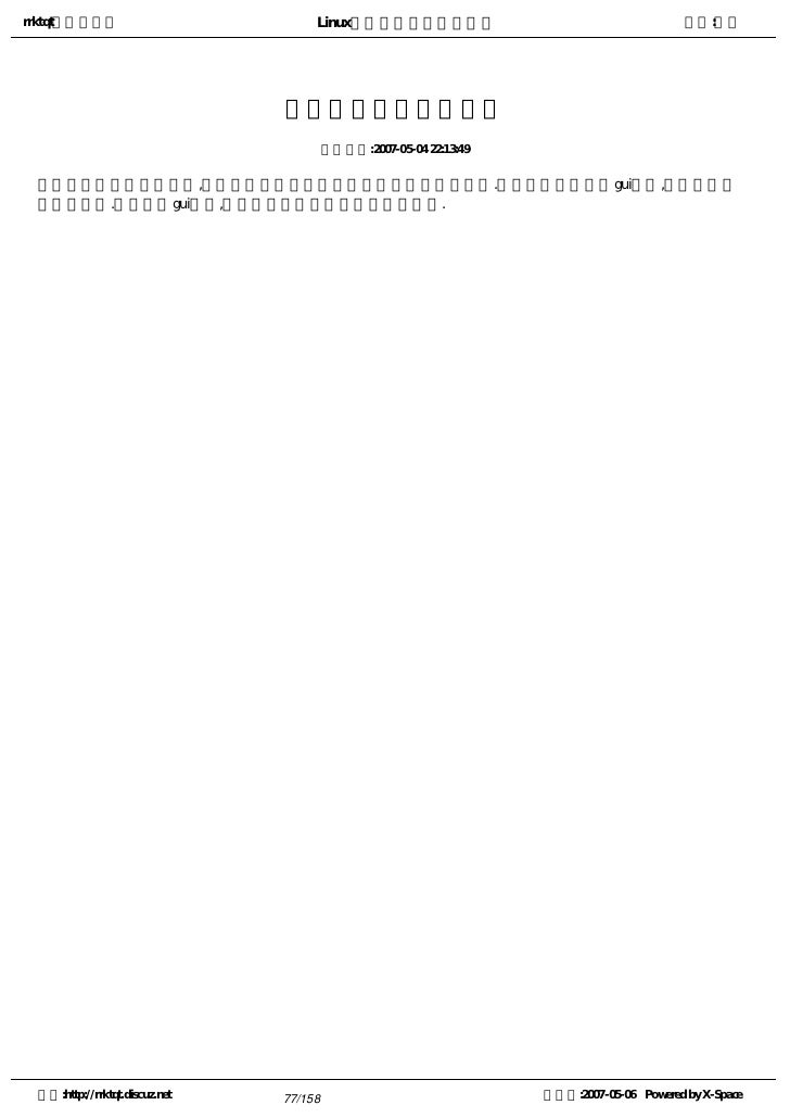 52. 52. rrktqt的个人空间 Linux实用培训教程第一部分 作者:红联 linux有无直观的图形操作界面 发布时间:2007-05-04 22:04:48   很多人认为只有windows系统才拥有gui,其实想找到完全没有图形用户界面的操作系统还真是困难,大多数的 操作系统都拥有图形界面,如freebsd等等,随着linux版本的升级,越来越多的linux程序都提供了窗口界面,所以linux 下也能进行类拟于windows下桌面的一些简单实用操作. 空间:http://rrktqt.discuz.net 52/158 制作于:2007-05-06 Powered by X-Space