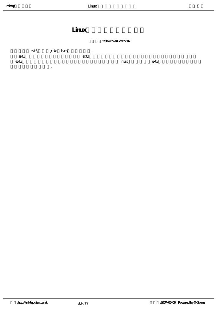 53. 53. rrktqt的个人空间 Linux实用培训教程第一部分 作者:红联 Linux中有哪些文件系统类型 发布时间:2007-05-04 22:05:16   主要有ext3,交换区,raid和lvm文件系统类型.   ext3的优点是强健的登记式文件系统,ext3文件系统在发生了不洁系统关机时能够提供更强健的数据完好 性.ext3文件系统允许用户选择数据接受的保护类型和级别,很多linux中现在都配置ext3文件卷来保持数据与文件 系统状态的高度一致性. 空间:http://rrktqt.discuz.net 53/158 制作于:2007-05-06 Powered by X-Space