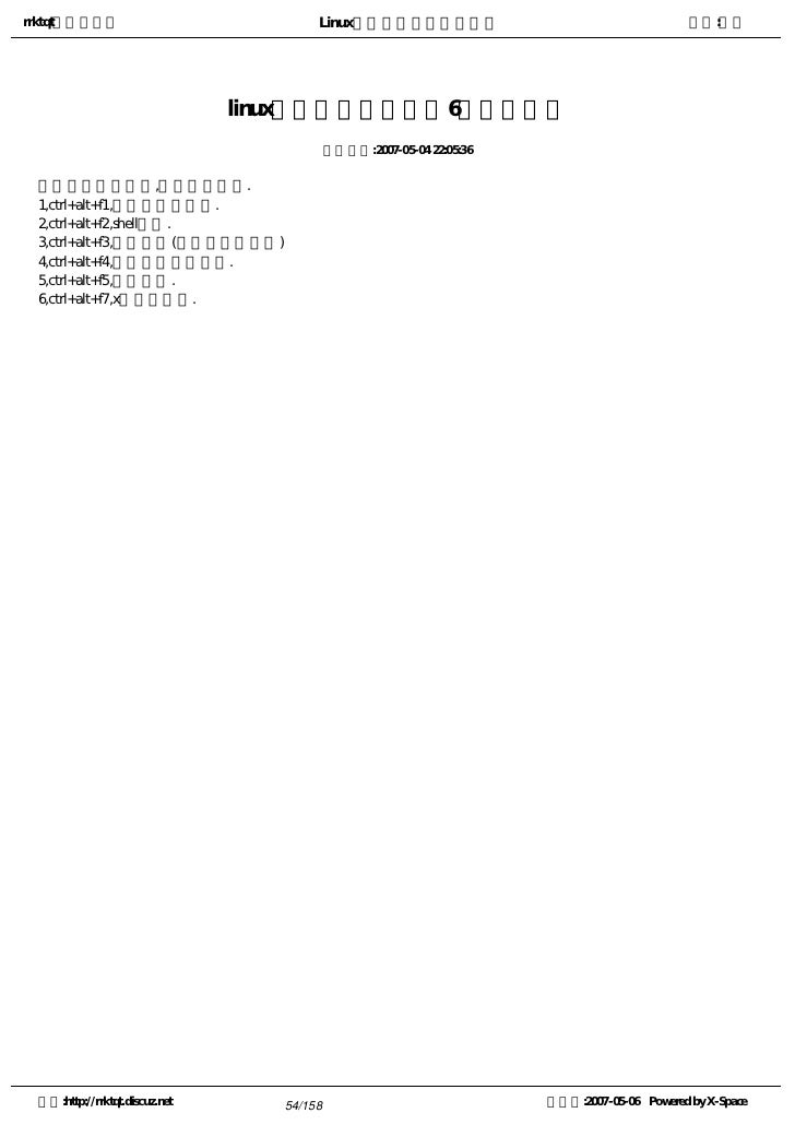 54. 54. rrktqt的个人空间 Linux实用培训教程第一部分 作者:红联 linux主机在控制台下的6个虚拟终端 发布时间:2007-05-04 22:05:36 他们分别是控制台,组合健和内容. 1,ctrl+alt+f1,安装提示对话框. 2,ctrl+alt+f2,shell提示. 3,ctrl+alt+f3,安装日志(安装程序的信息) 4,ctrl+alt+f4,与系统相关的消息. 5,ctrl+alt+f5,其他信息. 6,ctrl+alt+f7,x图形化显示. 空间:http://rrktqt.discuz.net 54/158 制作于:2007-05-06 Powered by X-Space