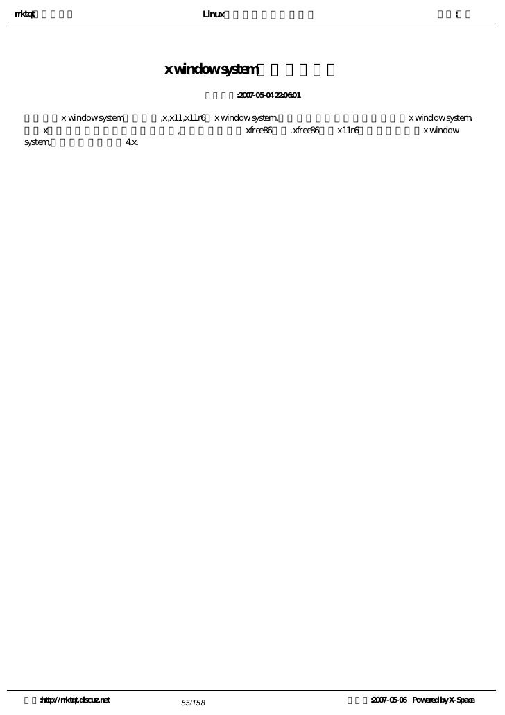 55. 55. rrktqt的个人空间 Linux实用培训教程第一部分 作者:红联 x window system的称呼有哪些 发布时间:2007-05-04 22:06:01   有关x window system的称呼有,x,x11,x11r6和x window system,其中正式而且用的最多的称呼是x window system.   x协会负责商业版本的开发与维护,免费的版本则由xfree86掌管.xfree86是以x11r6为基础所移植的x window system,目前最新的版本是4.x. 空间:http://rrktqt.discuz.net 55/158 制作于:2007-05-06 Powered by X-Space