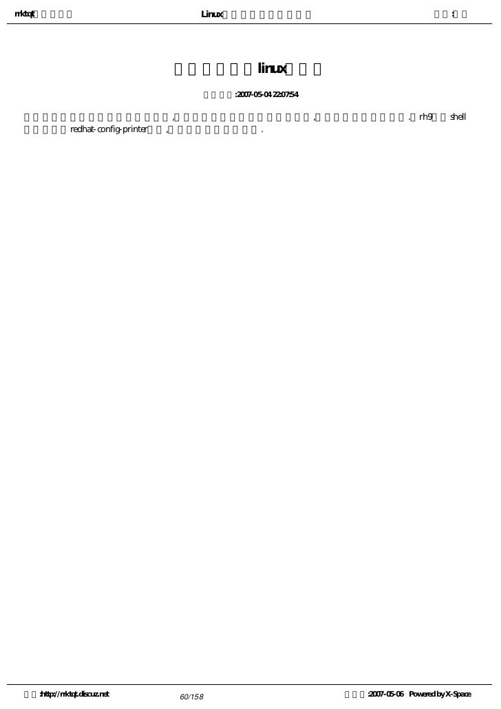 60. 60. rrktqt的个人空间 Linux实用培训教程第一部分 作者:红联 打印机无法在linux下工作 发布时间:2007-05-04 22:07:54   如果用户不清楚如何设置打印机,或者用户在设置打印机时遇到问题,可试用打印机配置工具.如rh9就在shell 提示下输入redhat-config-printer命令,可启动打印机配置工具. 空间:http://rrktqt.discuz.net 60/158 制作于:2007-05-06 Powered by X-Space
