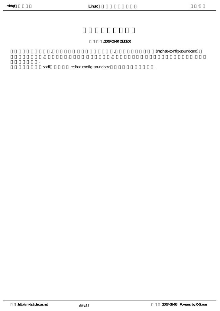 69. 69. rrktqt的个人空间 Linux实用培训教程第一部分 作者:红联 配置声卡遇到的问题 发布时间:2007-05-04 22:11:00   如果由于某种原因,声卡不能发声,但是已经安装了声卡,可以运行声卡配置工具(redhat-config-soundcard).要 启用声卡配置工具,可选择主菜单,系统设置,声卡检测命令,会打开一个广本框,提示用户输入根口令输入后,便可启 用声卡配置工具.   用户还可以在shell提示下输入redhat-config-soundcard命令来启动声卡配置工具. 空间:http://rrktqt.discuz.net 69/158 制作于:2007-05-06 Powered by X-Space