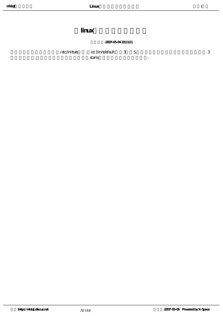 70. 70. rrktqt的个人空间 Linux实用培训教程第一部分 作者:红联 让linux引导进入图形化界面 发布时间:2007-05-04 22:11:21   用户可以在安装后编辑/etc/inittab文件.把id:3:initdefault:中的3改为5,系统将直接被引导进入图形化登录界面.3 代表文本界面,当然用户在文本提示符下输入startx命令也可以进入图形化界面. 空间:http://rrktqt.discuz.net 70/158 制作于:2007-05-06 Powered by X-Space