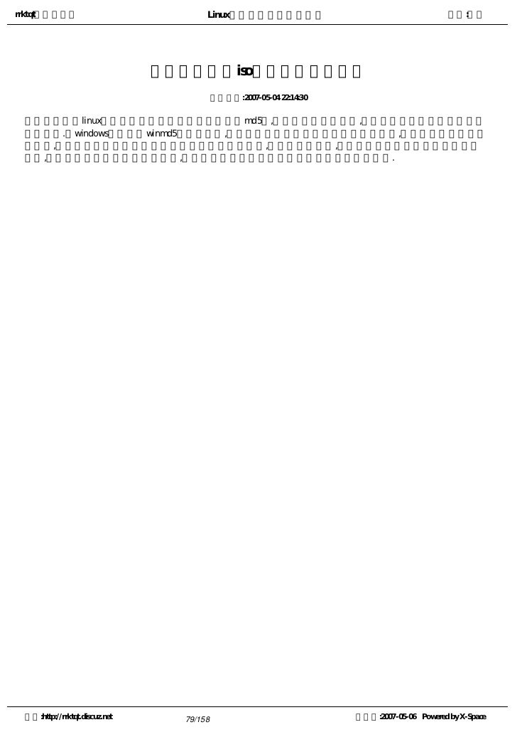 79. 79. rrktqt的个人空间 Linux实用培训教程第一部分 作者:红联 为什么下载的iso映像文件需要校验 发布时间:2007-05-04 22:14:30   一般下载linux系统时我们常常看到下载点提供有md5码,那就是常说的校验码,它用来判断你下载的文件是否 完好无损.在windows中可以用winmd5工具来校验,如果检测出来的结果与网站上提供的一致,说明你下载的文件是 完整的,很多大的文件在下载过程中难免会有文件损坏现象,所以必需要校验,否则在安装过程中可能会出现一些 问题,这点特别要提醒刻盘安装的朋友,为了能用上一个好的系统请在校验正确后方可刻盘. 空间:http://rrktqt.discuz.net 79/158 制作于:2007-05-06 Powered by X-Space