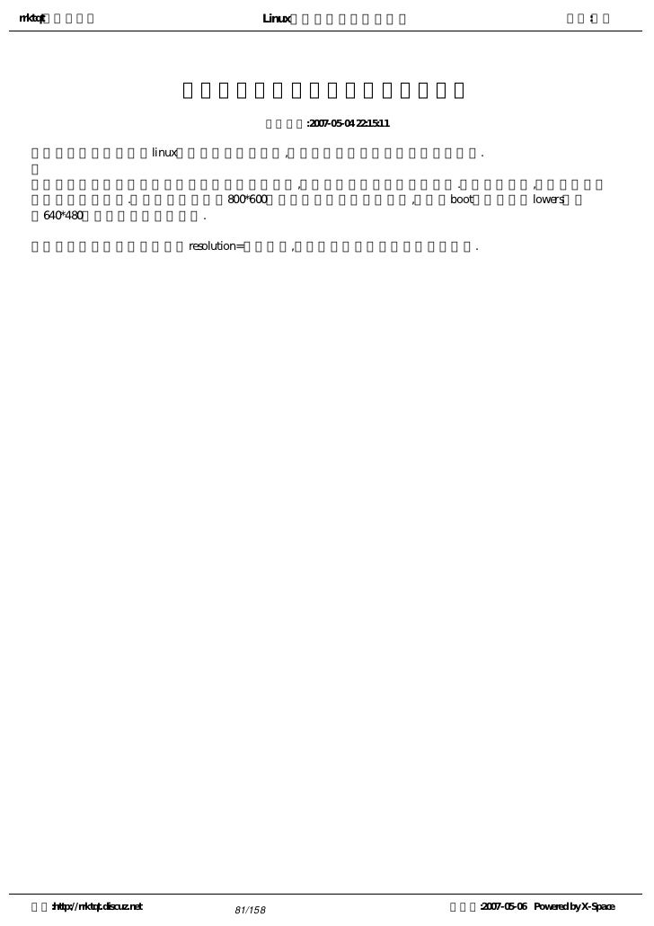 81. 81. rrktqt的个人空间 Linux实用培训教程第一部分 作者:红联 引导图形化安装遇到的问题解决方法 发布时间:2007-05-04 22:15:11   某些视频卡无法在linux安装程序中正确工作,导致引导图形化安装程序时出现问题.     如果安装程序无法按视频卡的默认设置来运行,将会在较低分辨率模式中运行.如果这还不行,安装程序将会 在文本模式中运行.对于视频卡不能在800*600分辨率环境下运行的计算机,应该在boot提示下输入lowers来使 用640*480的分辨率运行安装程序.   另一种可行的方法是使用resolution=引导选项,该选项对笔记本电脑用户最有帮助. 空间:http://rrktqt.discuz.net 81/158 制作于:2007-05-06 Powered by X-Space