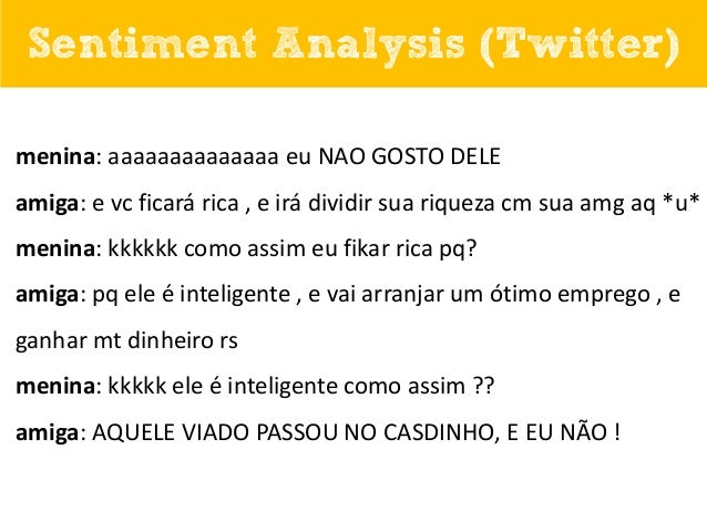 12. 12. Sentiment Analysis (Twitter) menina: aaaaaaaaaaaaaa eu NAO GOSTO DELE amiga: e vc ficará rica , e irá dividir sua riqueza cm sua amg aq *u* menina: kkkkkk como assim eu fikar rica pq? amiga: pq ele é inteligente , e vai arranjar um ótimo emprego , e ganhar mt dinheiro rs menina: kkkkk ele é inteligente como assim ?? amiga: AQUELE VIADO PASSOU NO CASDINHO, E EU NÃO !