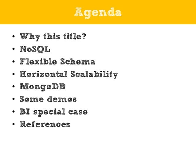 2. 2. Agenda • Why this title? • NoSQL • Flexible Schema • Horizontal Scalability • MongoDB • Some demos • BI special case • References