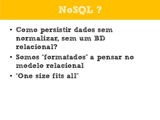 21. 21. • Como persistir dados sem normalizar, sem um BD relacional? • Somos “formatados” a pensar no modelo relacional • “One size fits all” NoSQL ?