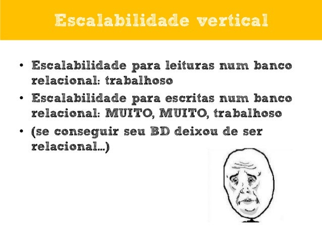35. 35. • Escalabilidade para leituras num banco relacional: trabalhoso • Escalabilidade para escritas num banco relacional: MUITO, MUITO, trabalhoso • (se conseguir seu BD deixou de ser relacional...) Escalabilidade vertical