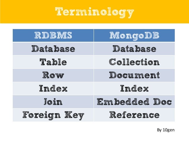 49. 49. Terminology RDBMS MongoDB Database Database Table Collection Row Document Index Index Join Embedded Doc Foreign Key Reference By 10gen