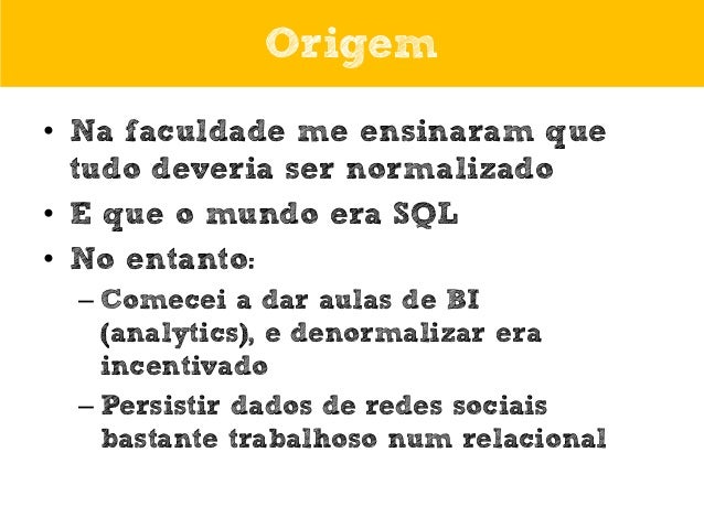 5. 5. • Na faculdade me ensinaram que tudo deveria ser normalizado • E que o mundo era SQL • No entanto: – Comecei a dar aulas de BI (analytics), e denormalizar era incentivado – Persistir dados de redes sociais bastante trabalhoso num relacional Origem