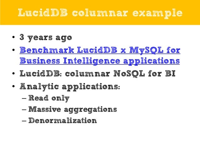 56. 56. • 3 years ago • Benchmark LucidDB x MySQL for Business Intelligence applications • LucidDB: columnar NoSQL for BI • Analytic applications: – Read only – Massive aggregations – Denormalization LucidDB columnar example