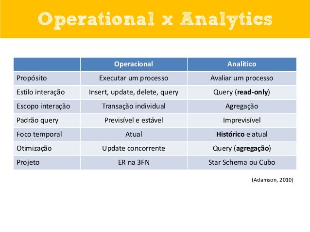 9. 9. Operacional Analítico Propósito Executar um processo Avaliar um processo Estilo interação Insert, update, delete, query Query (read-only) Escopo interação Transação individual Agregação Padrão query Previsível e estável Imprevisível Foco temporal Atual Histórico e atual Otimização Update concorrente Query (agregação) Projeto ER na 3FN Star Schema ou Cubo (Adamson, 2010) Operational x Analytics