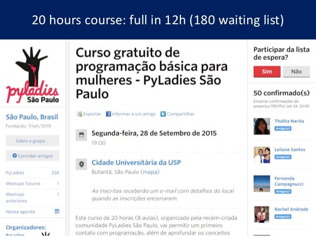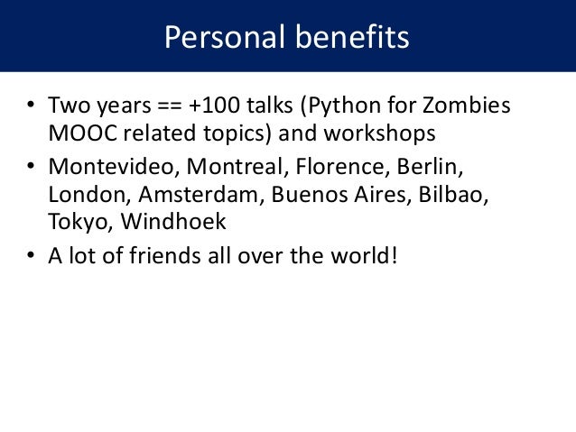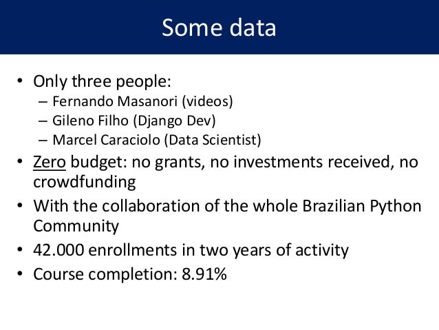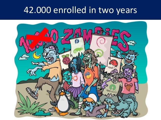 Python for Zombies MOOC is the first brazilian MOOC to teach programming. With a team made up of three folks and no budget, we have reached 42.000 enrollments in two years of activity. After having taken the course, some former girl students even founded the first PyLadies groups in Brazil. There are a lot of Massive Open Online Courses that teach programming in Python (Coursera, Edx, Udacity), but only 5% of the Brazilian people are fluent in English. For this reason, the Brazilian Python community took the initiative to develop the first MOOC to teach programming in Portuguese. The initiative of this MOOC does not come from the University where I am a professor.