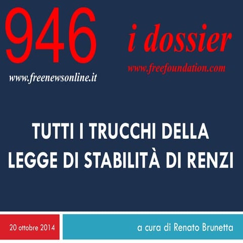 9. 9. 9 PERCHÉ FIRMIAMO PER L’ABROGAZIONE DELLA RIFORMA FORNERO DELLE PENSIONI I provvedimenti del ministro tecnico Fornero hanno allontanato il nostro paese dal mainstream europeo cui era approdato grazie ai provvedimenti del governo Berlusconi; Un grave passo indietro cui né il governo Letta con il ministro Giovannini né il governo Renzi con il ministro Poletti sono riusciti a porre rimedio; Oggi presentiamo la soluzione: il referendum. Che, entrando nel merito, vuol dire ritorno alla riforma delle pensioni che era stata avviata dal governo Berlusconi. 9