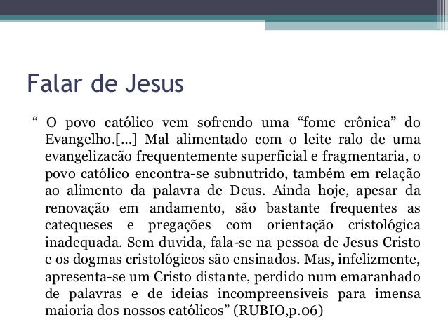 13. 13. Falar de Jesus “ O povo católico vem sofrendo uma “fome crônica” do Evangelho.[…] Mal alimentado com o leite ralo de uma evangelizacão frequentemente superficial e fragmentaria, o povo católico encontra-se subnutrido, também em relação ao alimento da palavra de Deus. Ainda hoje, apesar da renovação em andamento, são bastante frequentes as catequeses e pregações com orientação cristológica inadequada. Sem duvida, fala-se na pessoa de Jesus Cristo e os dogmas cristológicos são ensinados. Mas, infelizmente, apresenta-se um Cristo distante, perdido num emaranhado de palavras e de ideias incompreensíveis para imensa maioria dos nossos católicos” (RUBIO,p.06)
