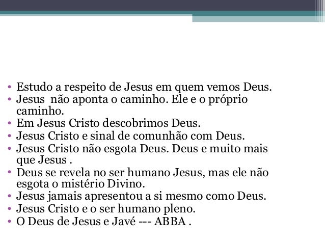 15. 15. • Estudo a respeito de Jesus em quem vemos Deus. • Jesus não aponta o caminho. Ele e o próprio caminho. • Em Jesus Cristo descobrimos Deus. • Jesus Cristo e sinal de comunhão com Deus. • Jesus Cristo não esgota Deus. Deus e muito mais que Jesus . • Deus se revela no ser humano Jesus, mas ele não esgota o mistério Divino. • Jesus jamais apresentou a si mesmo como Deus. • Jesus Cristo e o ser humano pleno. • O Deus de Jesus e Javé --- ABBA .