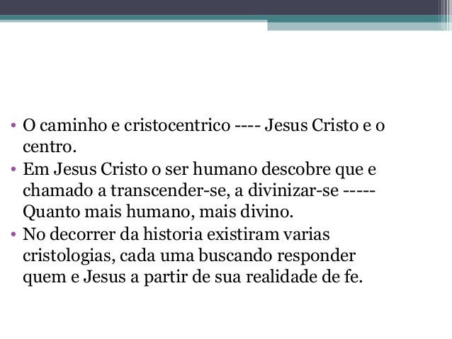 16. 16. • O caminho e cristocentrico ---- Jesus Cristo e o centro. • Em Jesus Cristo o ser humano descobre que e chamado a transcender-se, a divinizar-se ----- Quanto mais humano, mais divino. • No decorrer da historia existiram varias cristologias, cada uma buscando responder quem e Jesus a partir de sua realidade de fe.