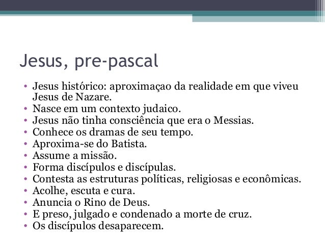 17. 17. Jesus, pre-pascal • Jesus histórico: aproximaçao da realidade em que viveu Jesus de Nazare. • Nasce em um contexto judaico. • Jesus não tinha consciência que era o Messias. • Conhece os dramas de seu tempo. • Aproxima-se do Batista. • Assume a missão. • Forma discípulos e discípulas. • Contesta as estruturas políticas, religiosas e econômicas. • Acolhe, escuta e cura. • Anuncia o Rino de Deus. • E preso, julgado e condenado a morte de cruz. • Os discípulos desaparecem.