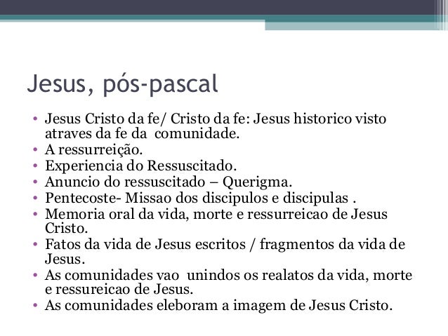 18. 18. Jesus, pós-pascal • Jesus Cristo da fe/ Cristo da fe: Jesus historico visto atraves da fe da comunidade. • A ressurreição. • Experiencia do Ressuscitado. • Anuncio do ressuscitado – Querigma. • Pentecoste- Missao dos discipulos e discipulas . • Memoria oral da vida, morte e ressurreicao de Jesus Cristo. • Fatos da vida de Jesus escritos / fragmentos da vida de Jesus. • As comunidades vao unindos os realatos da vida, morte e ressureicao de Jesus. • As comunidades eleboram a imagem de Jesus Cristo.