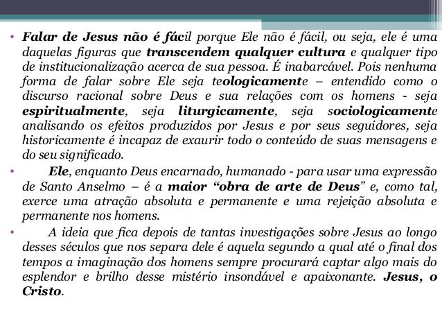 2. 2. • Falar de Jesus não é fácil porque Ele não é fácil, ou seja, ele é uma daquelas figuras que transcendem qualquer cultura e qualquer tipo de institucionalização acerca de sua pessoa. É inabarcável. Pois nenhuma forma de falar sobre Ele seja teologicamente – entendido como o discurso racional sobre Deus e sua relações com os homens - seja espiritualmente, seja liturgicamente, seja sociologicamente analisando os efeitos produzidos por Jesus e por seus seguidores, seja historicamente é incapaz de exaurir todo o conteúdo de suas mensagens e do seu significado. • Ele, enquanto Deus encarnado, humanado - para usar uma expressão de Santo Anselmo – é a maior “obra de arte de Deus” e, como tal, exerce uma atração absoluta e permanente e uma rejeição absoluta e permanente nos homens. • A ideia que fica depois de tantas investigações sobre Jesus ao longo desses séculos que nos separa dele é aquela segundo a qual até o final dos tempos a imaginação dos homens sempre procurará captar algo mais do esplendor e brilho desse mistério insondável e apaixonante. Jesus, o Cristo.
