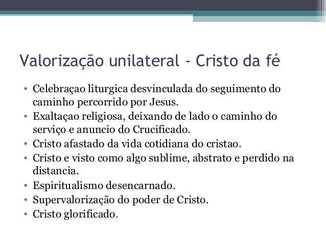 19. 19. Valorização unilateral - Cristo da fé • Celebraçao liturgica desvinculada do seguimento do caminho percorrido por Jesus. • Exaltaçao religiosa, deixando de lado o caminho do serviço e anuncio do Crucificado. • Cristo afastado da vida cotidiana do cristao. • Cristo e visto como algo sublime, abstrato e perdido na distancia. • Espiritualismo desencarnado. • Supervalorização do poder de Cristo. • Cristo glorificado.