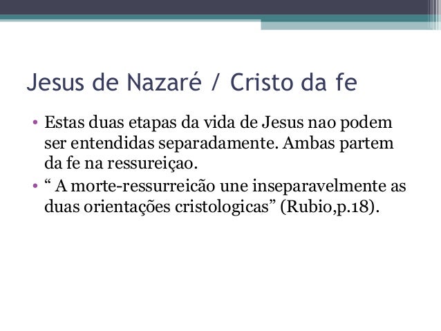 21. 21. Jesus de Nazaré / Cristo da fe • Estas duas etapas da vida de Jesus nao podem ser entendidas separadamente. Ambas partem da fe na ressureiçao. • “ A morte-ressurreicão une inseparavelmente as duas orientações cristologicas” (Rubio,p.18).