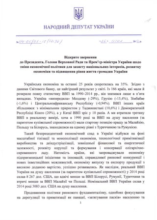 Відкрите звернення до Президента, Голови Верховної Ради та Прем’єр-міністра України щодо зміни економічної політики для захисту національних інтересів, розвитку економіки та підвищення рівня життя громадян України