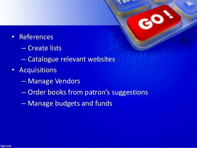 10. 10. • References – Create lists – Catalogue relevant websites • Acquisitions – Manage Vendors – Order books from patron’s suggestions – Manage budgets and funds